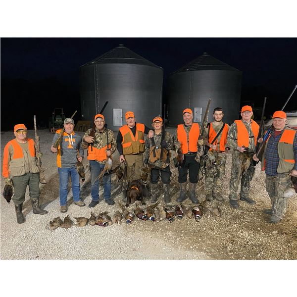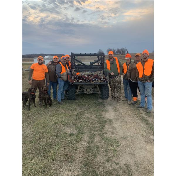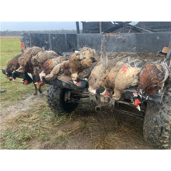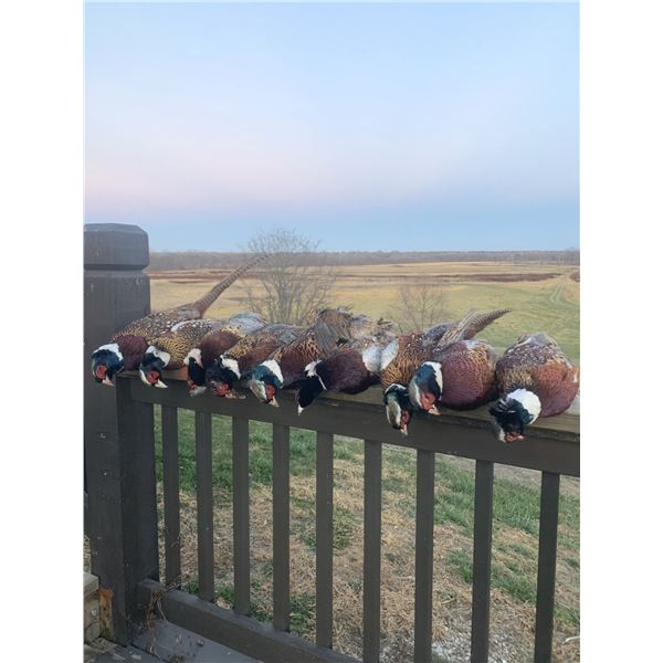 Package includes: Lodging, meals & beverages, professional guides, field prep, upto 5 pheasants per day/hunter, use of dogs, and transportation during trip. Not included: Tips to guides & staff, transportation to/from camp, airport pickup/dropoff, license fee, extra birds, whitetail trophy fee and taxidermy/shipping.