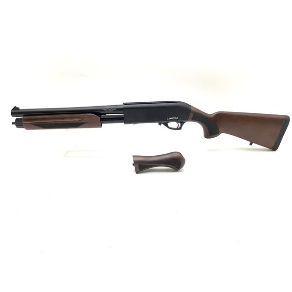 Canuck Regulator / Defender Pump Action 12Ga Shotgun 3" Chamber 14" Barrel Wood Stock, New. Fixed front sight, removable choke. Comes with second grip. This is a non-restricted firearm.