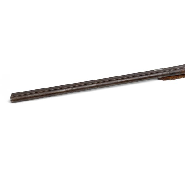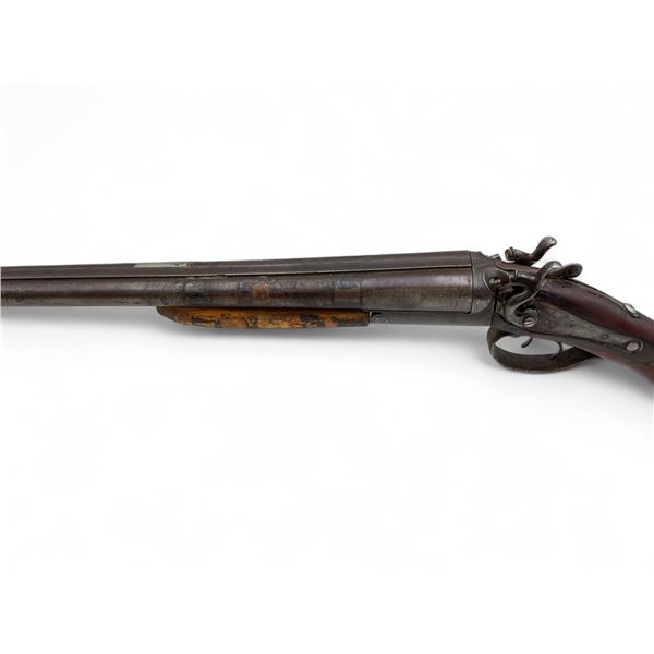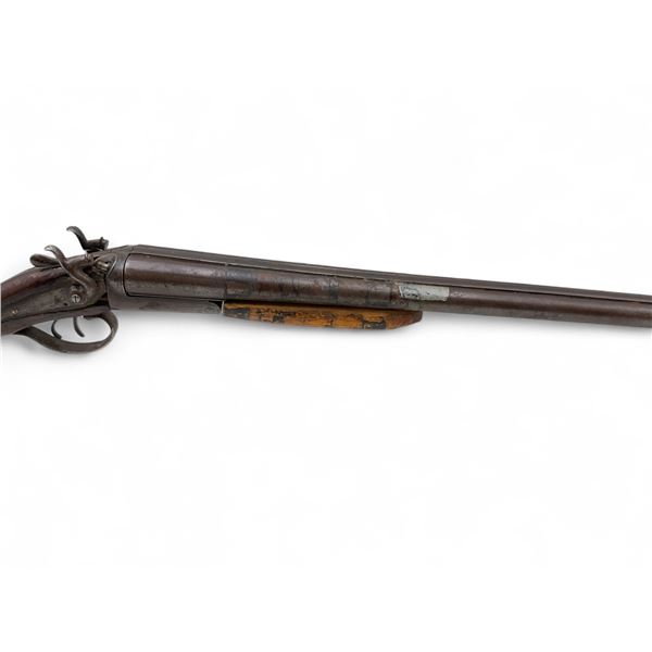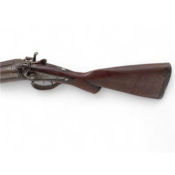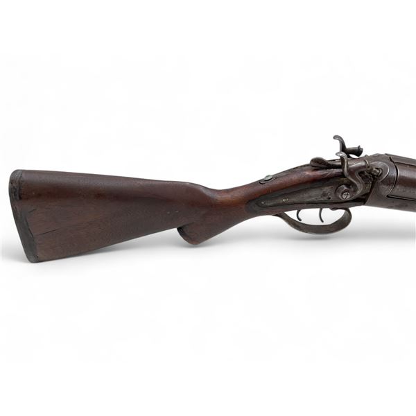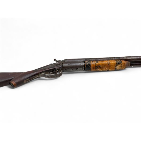 E. James And Co Side By Side 12Ga Shotgun 31" Barrels Wood Stock. Fixed chokes; double triggers. Rear stock is not original and is not fitted correctly. Wood forend is not secured and is not the correct one. Exposed hammers; right hammer does not lock back. Overall in poor condition; may be missing other parts. This is a non-restricted firearm.