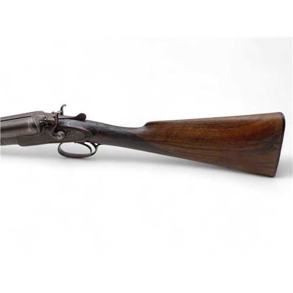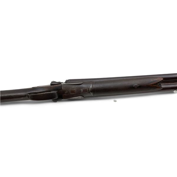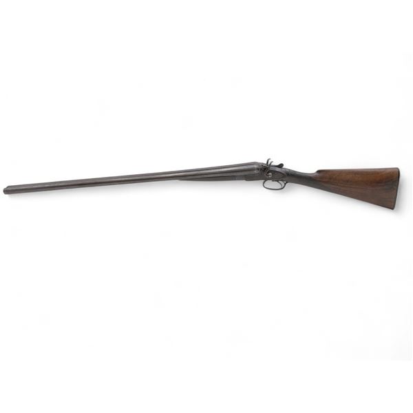 Hughes Side By Side Shotgun 12Ga 30" Barrels Wood Stock. Fixed chokes; Damascus Steel barrels; right hand barrel has several dents in it. Exposed hammers. Double triggers; front trigger broken. Rear stock cracked and loose; wood forend broke at front. This is a non-restricted firearm.