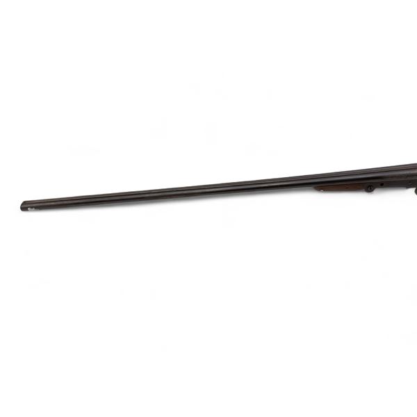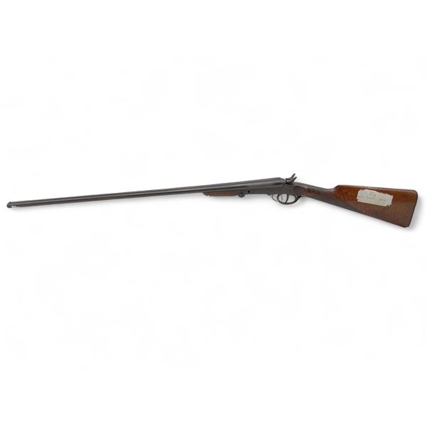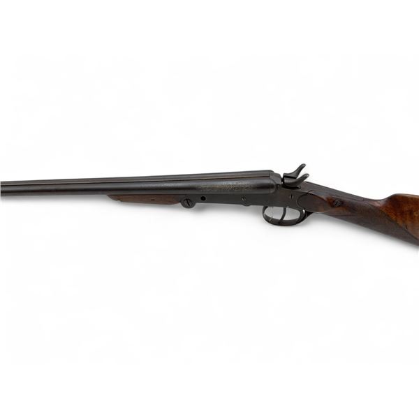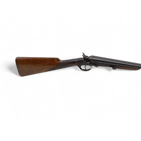 Unknown Folding Side By Side 410 Shotgun 29" Barrels Wood Stock. Bead sight, fixed chokes. Dual exposed hammers, double triggers. Missing hardware on side of receiver. Rear stock has small crack in it; wood forend has damage around the screw hole. This is a non-restricted firearm.