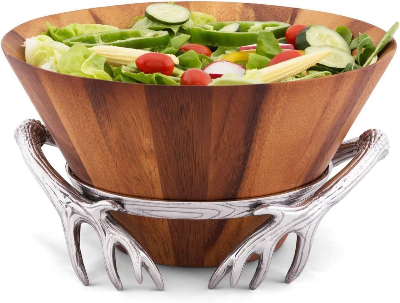 Arthur Court Acadia wood bowl with sandcast, handcrafted aluminum antler stand. Bowl removes from base for easy prep and cleaning. Includes stag antler salad tongs. . Includes antler stag salad tongs. DALLAS SAFARI CLUB THANKS BRENDA HEARD AND FRIEND OF DSC FOR THIS 100% DONATION. Pickup or shipping: Christie Selle, christie@biggame.org.