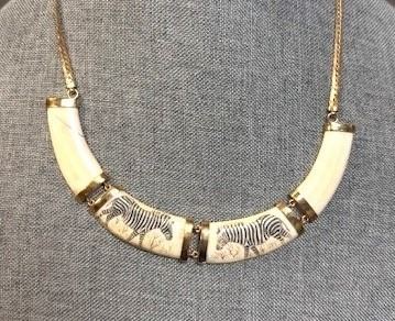 This lovely warthog tusk necklace features hand painted zebras, 18k gold over silver chain/mounts and lobster claw closure, measures 18" long. DALLAS SAFARI CLUB THANKS MICHAEL & IRRA CORE FOR THIS 100% DONATION. Pickup or shipping: Contact Christie Selle at christie@biggame.org.