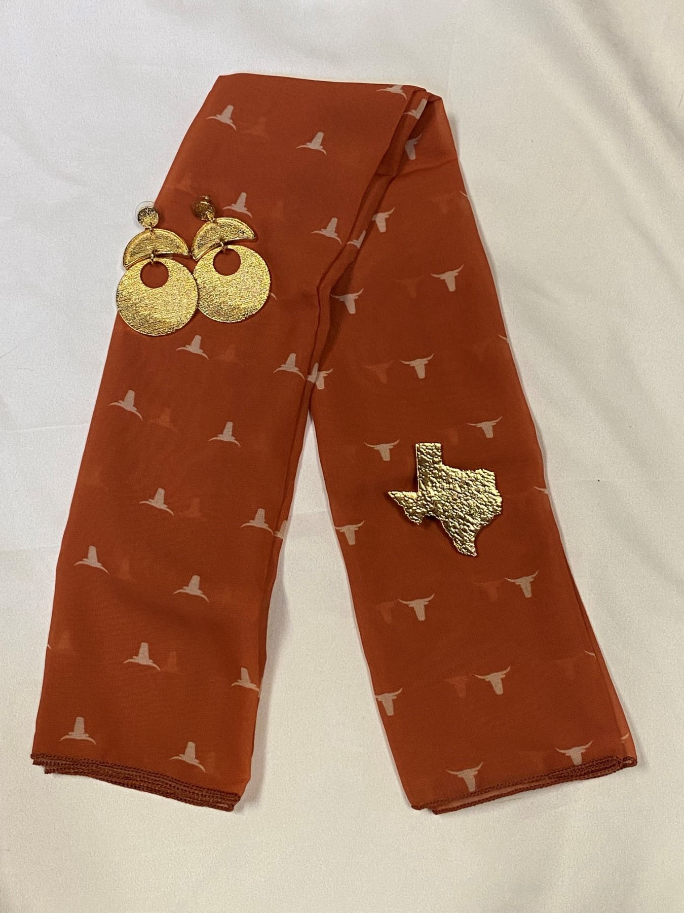 This Hook Em Horns inspired set of ladies accessories includes a lovely twill scarf, Texas shaped scarf clip and gold plated earrings. DALLAS SAFARI CLUB THANKS FEDHA NYUKI FOR THIS 100% DONATION. Leslie Benavides, info@fedhanyuki.com, 361-207-4806, Booth #512.