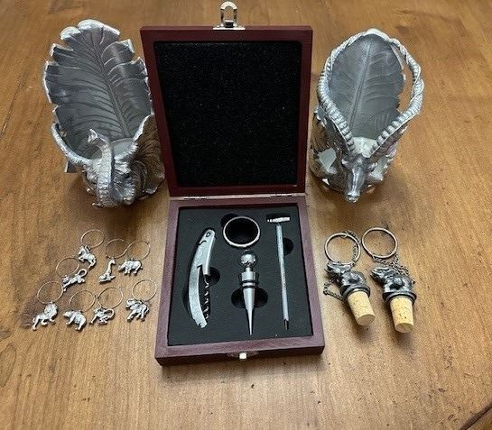 This wonderful Arthur Court elephant themed wine accessories set includes 2x wine coolers, 2x wine cork toppers, wine opener/serving tools with wood storage case and 8x wine bottle stem identifiers. Also includes 6x Arthur Court giraffe napkin rings. DALLAS SAFARI CLUB THANKS EDIE ROSE FOR THIS 100% DONATION. Pickup or shipping: Contact Christie Selle at christie@biggame.org.
