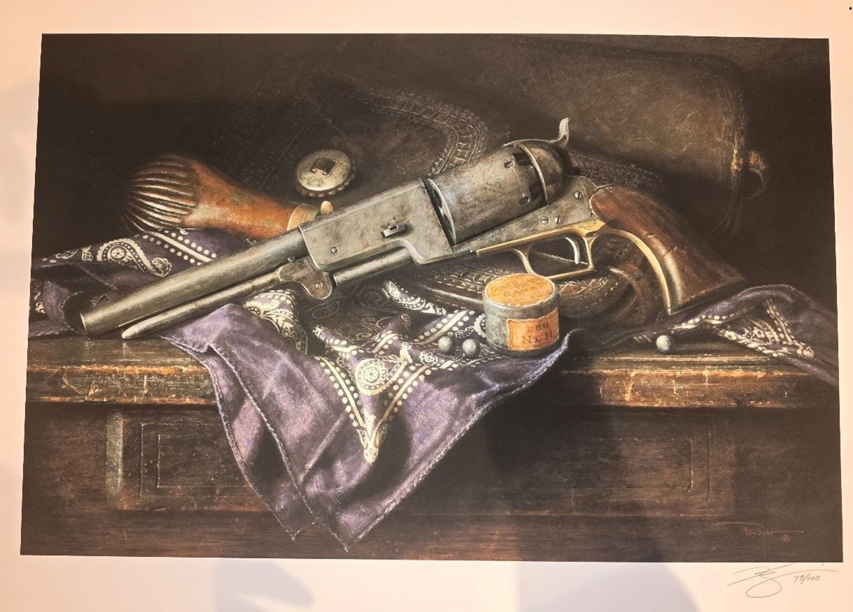"Cold Walker" - Signed/numbered, limited edition 75/100 print with authentication embossing by renowned western realist painter, Kyle Polzin. The artist is celebrated for his meticulous still-life compositions that pay homage to American frontier history. This particular print captures the legendary Colt Walker revolver designated in 1847 for the Texas Rangers rendered with Poltzin's signature attention to detail and historic authenticity. DALLAS SAFARI CLUB THANKS DAVID & EVA STALNAKER FOR THIS 100% DONATION. Pickup or shipping: Contact Christie Selle, christie@biggame.org.