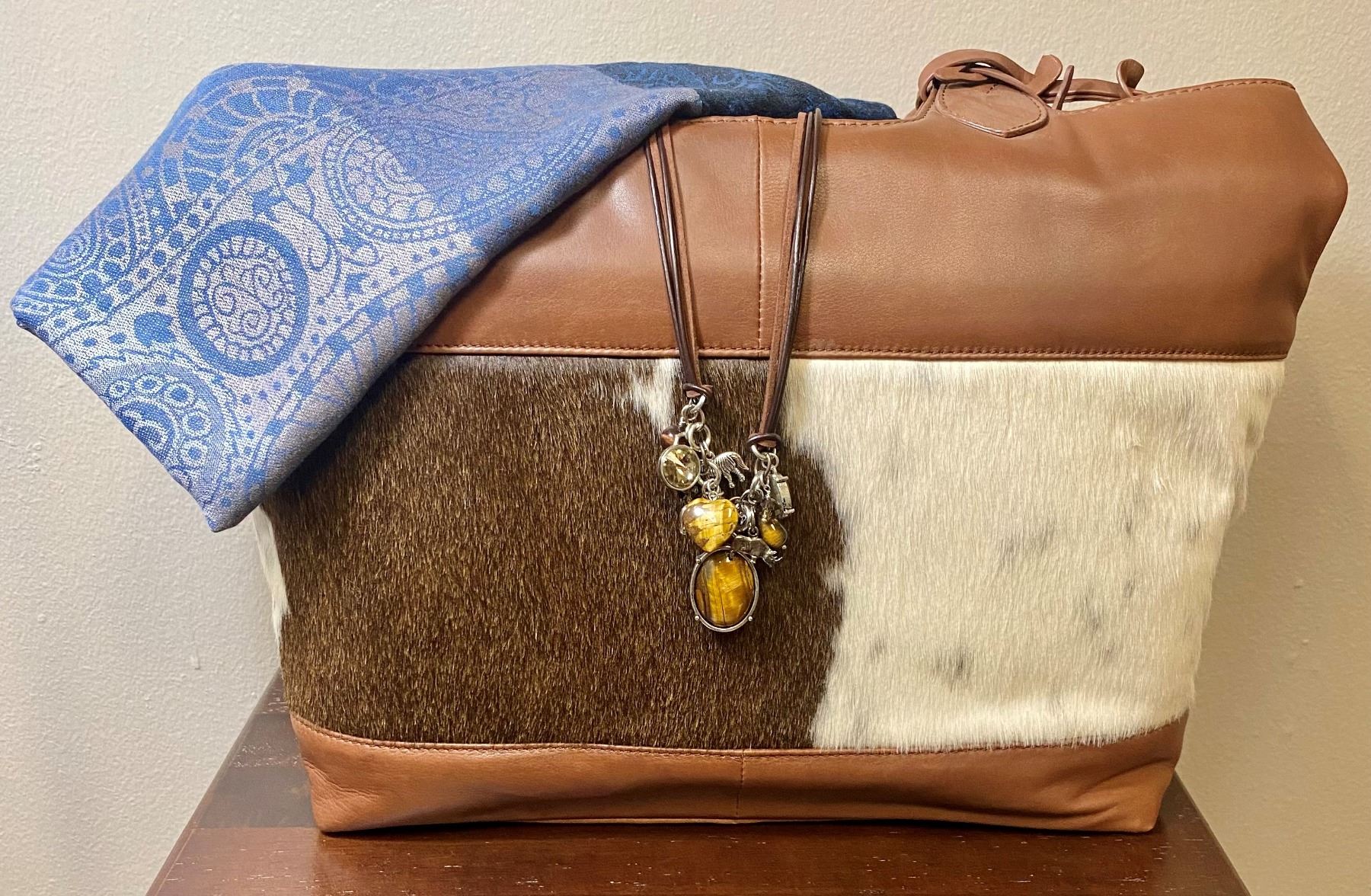 You can' have enough accessories and you won't want to live without this must-have trio that includes a fantastic brown leather cowhide purse, multi-charm & mixed stone leather necklace and beautiful 3-tone blue Spanish scarf. DALLAS SAFARI CLUB THANKS MARK & CAROL LITTLE FOR THIS 100% DONATION. Pickup or shipping: Contact Christie Selle at christie@biggame.org.