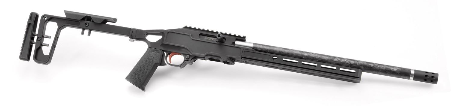 The Ruger 10/22 carbon fiber rifle in 22 LR caliber with Grey Birch stock features a modular 10" forend with M-LOK, Arca-Swiss compatibility and ambidextrous QD points. The stock is adjustable for length of pull and cheek height and folds for easy storage and transport.Hard-coat anodized, CNC-machined receiver made from heat treated and stress relieved aluminum allows for optimal receiver-to-bolt interaction and a match-grade feel.Cold hammer-forged barrel tensioned in carbon fiber sleeve features a 1/2"-28 threaded muzzle and is fitted with a thread cap which can be removed to allow for the use of muzzle accessories. BX-Trigger® with a light, crisp 2.5 - 3 pound trigger pull weight with minimal overtravel and a positive reset.