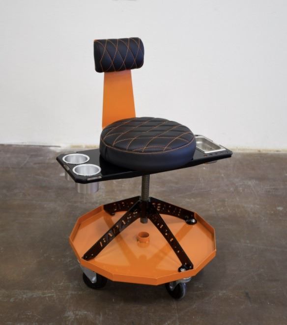 Take a well-deserved break with this heavy duty Garage stool engineered for comfort, durability and style by Badass Workbench. Made from all-steel construction, this stool is perfect for the shop, garage or even your home. The plush seat with diamond-stitched detailing offers comfort with flair and the height-adjustable ACME screw allows for customized seating from 16" to 24". Stool is fitted with a greaseable ACME nut for smooth adjustments and rolls effortlessly on four 4" black poly caster wheels, rated for 250 lbs each, with a total weight capacity of 400 lbs. Enjoy the built-in bottle opener on the backrest arm, making this stool as tough and dependable as you are. DALLAS SAFARI CLUB THANKS BADASS WORKBENCH FOR THIS 100% DONATION. Cody Freeze, cody@badassworkbench.com, Booth #2119.