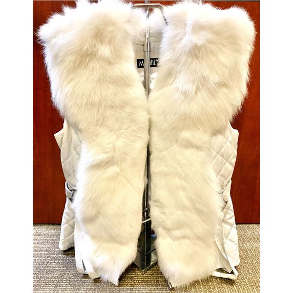 This dyed white, quilted Italian lamb leather vest features an over-sized white fox tuxedo collar, full front zipper and size adjustable side straps; measures 24"L and available in sizes small-3X. At Alaska Fur Gallery, distinctive apparel and complete support services have been our trademark since 1935. DALLAS SAFARI CLUB THANKS ALASKA FUR GALLERY FOR THIS 100% DONATION. Malena Hausinger, info@akfurgallery.com, 907-274-3877.