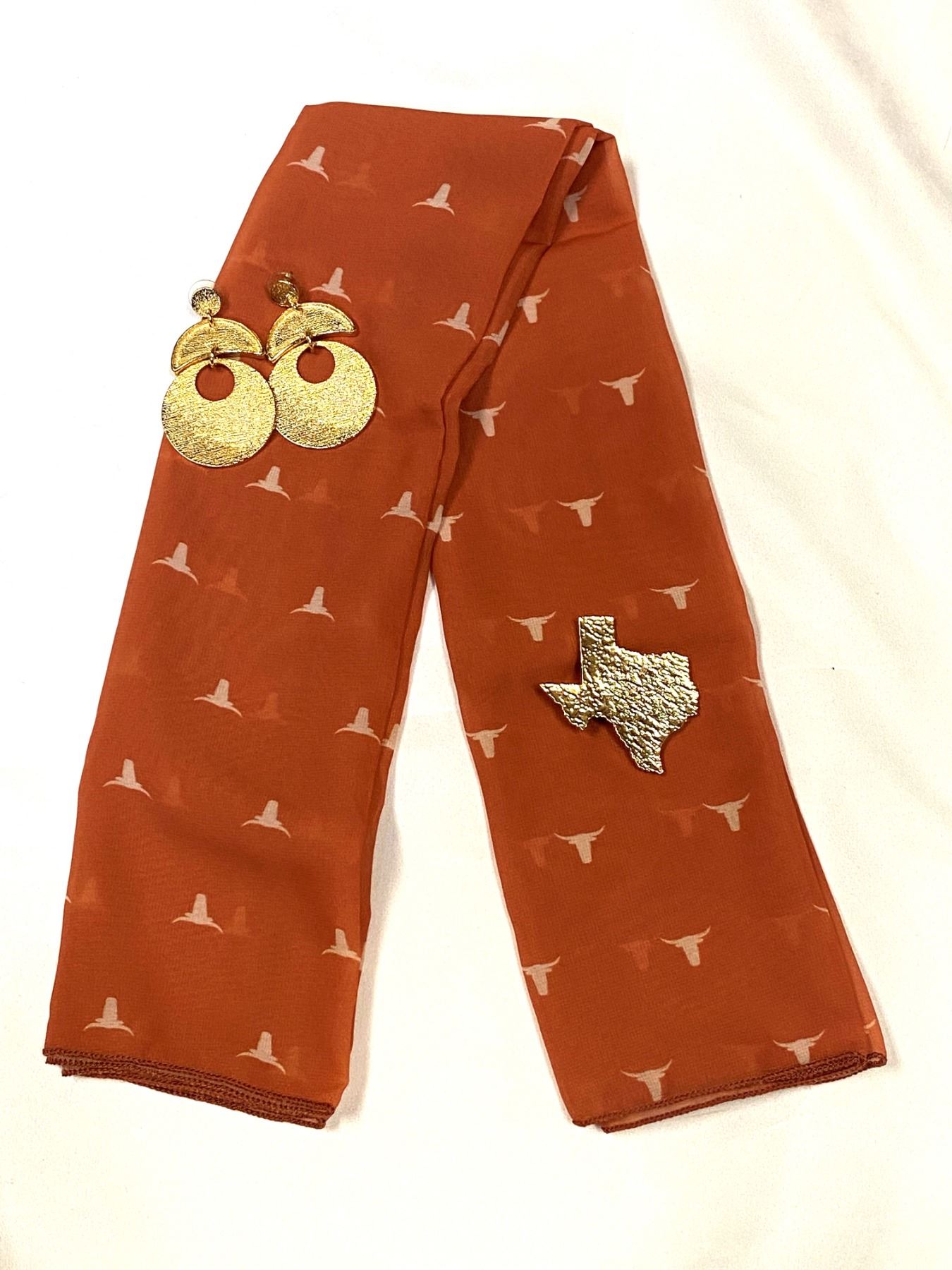This Hook Em Horns inspired set of ladies accessories includes a lovely twill scarf, Texas shaped scarf clip and gold plated earrings. DSC FOUNDATION THANKS FEDHA NYUKI FOR THIS 100% DONATION. Leslie Benavides, info@fedhanyuki.com, Booth #512.