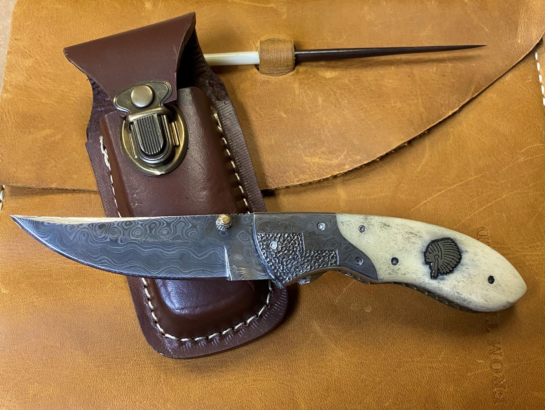 Buck Knives folding knife with leather sheath. DSC FOUNDATION THANKS RUSSELL & MARY EDITH STACY FOR THIS 100% DONATION.