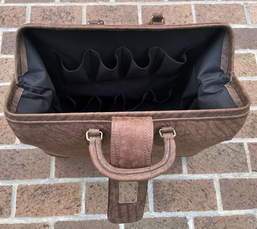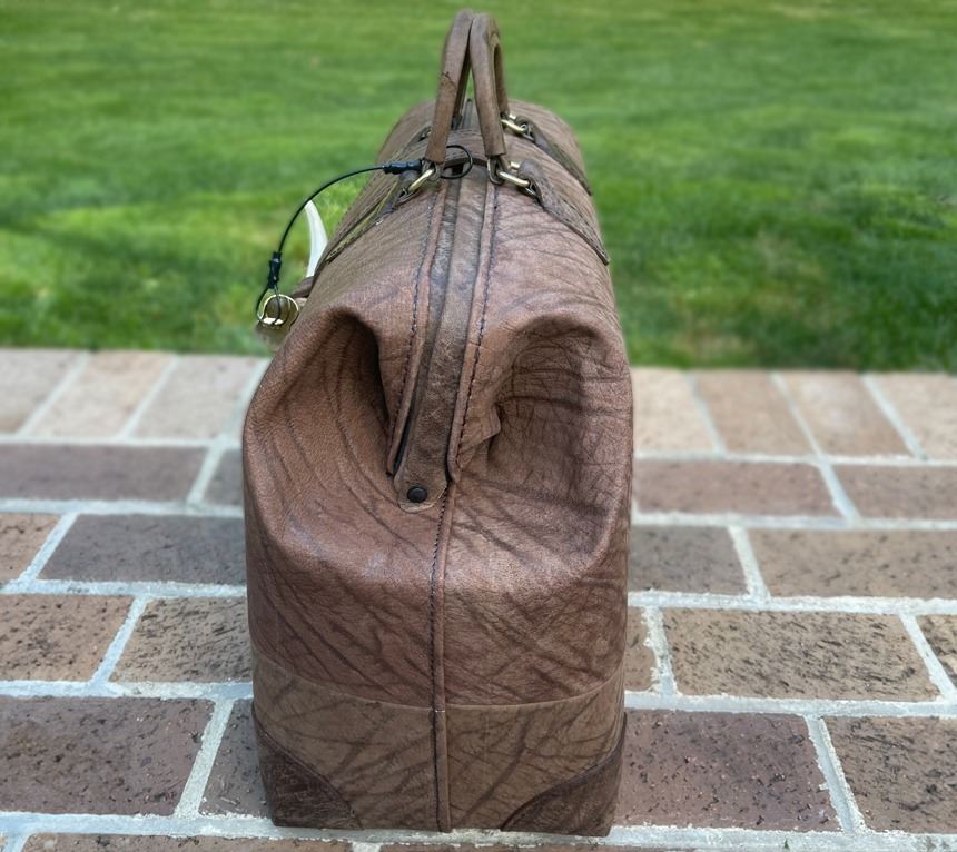 This hand-sewn Doctors Bag is truly a one-of-a-kind as it is the only one in subtly dimpled warthog hide. Bag is hand-crafted in the USA from high-quality leather and measures 18" wide, 16" tall and 8" deep. The hinged, rolled steel leather covered top opens up wide for easy access, just like pastime Doctors bags. The clasp is a hand-polished warthog tusk that measures approximately 7" around the curve. The tusk has been cut down so it is appropriately sized for this piece. The warthog tusk slides through a leather loop that comes through a window on the side of the bag. It has a custom fitted brass cap/post that is permanently affixed to the bag so you never have to worry about leaving it behind. The interior is fully lined with black rip resistant, anti-microbial vinyl fabric and includes 1x large zippered pocket and 2x rows of four small organizer loops for underwear, socks, belts and other small garments. Reinforced corners, five brass feet on the bottom and extra-thick stitching means this bag will last several lifetimes. Make it even more special by having the lucky recipient's name monogrammed on the strip of leather above the tusk. DSC FOUNDATION THANKS AFRICAN SPORTING CREATIONS FOR THIS 100% DONATION. Jim Morando, jkmorando@aol.com, Booth #1004.