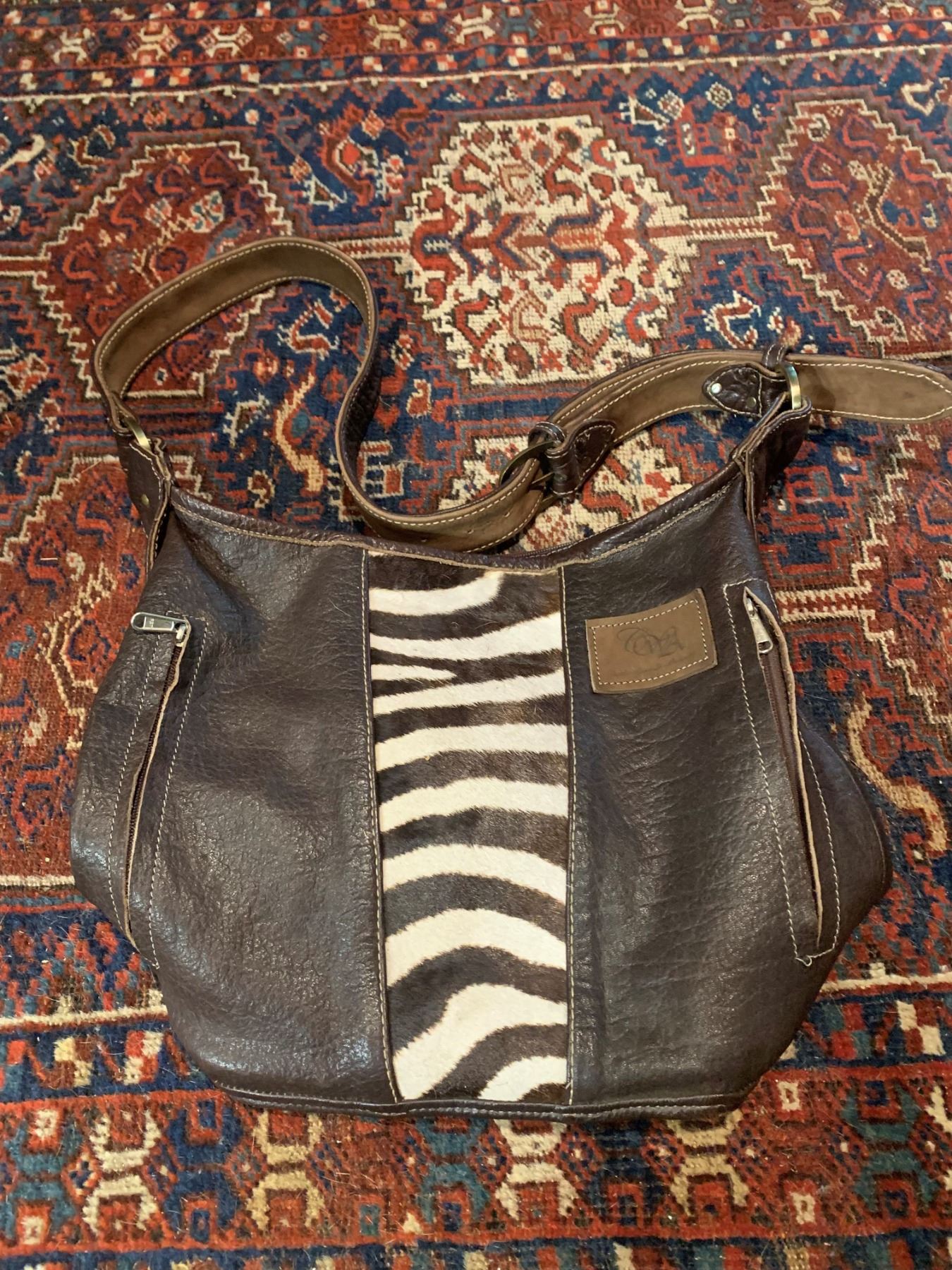 Cape buffalo leather and zebra hide purse. Features include silk/satin lined, interior has a partition of two pockets under the main zipper, two exterior easy access pockets that can be used for concealed carry purposes if desired, suede-lined shoulder strap, brass hardware and sturdy rivets. DSC FOUNDATION THANKS CRAIG DIXON FOR THIS 100% DONATION.
