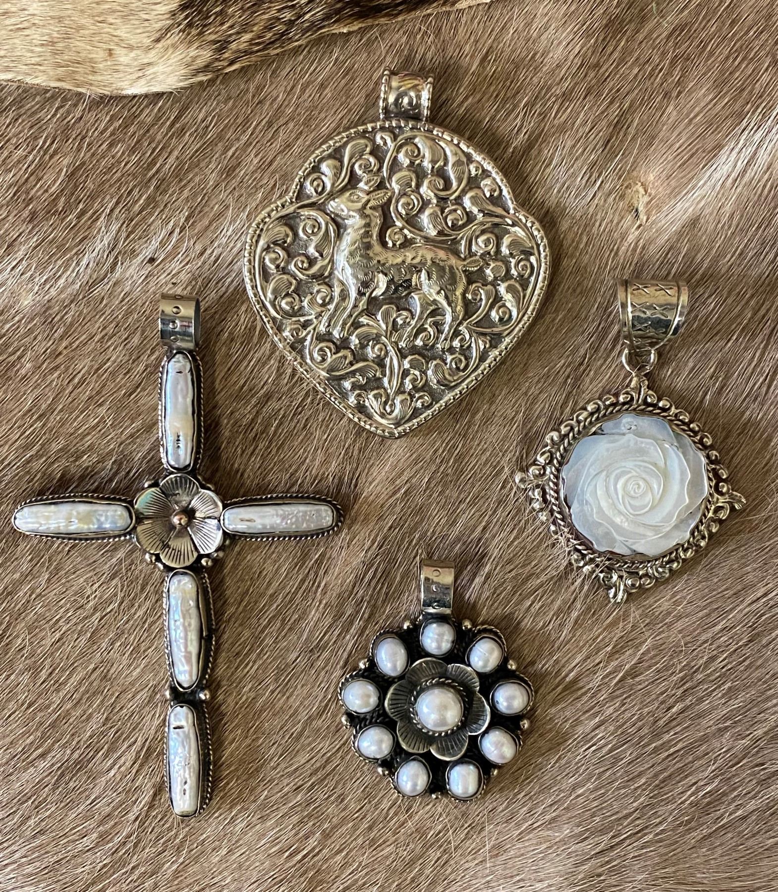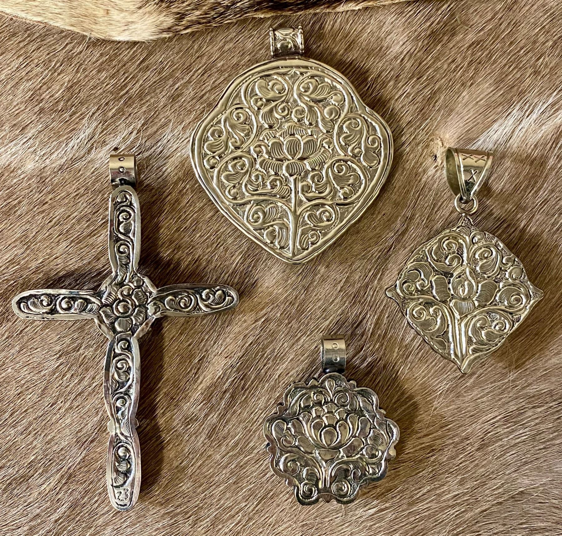 These eye-catching, handcrafted Tibetan silver pendants were made in the Himalayas of Nepal and showcase true Tibetan craftsmanship and artistry. Tibetan jewelry uses a technique called "repoussé", which is from the French, meaning "pushed up from behind". All four pendants feature this intricate design on the back, with the large one featuring floral and animal repoussé on the front, while the cross and two smaller pendants also feature Mother of Pearl. The repoussé technique involves pushing a silver surface outward from behind to create a three-dimensional effect on the surface of the metal. Then, a technique called "chasing" is used to work the details of the design on the front, back or outside of the piece to create the final pattern. DSC FOUNDATION THANKS CRAIG DIXON FOR THIS 100% DONATION.