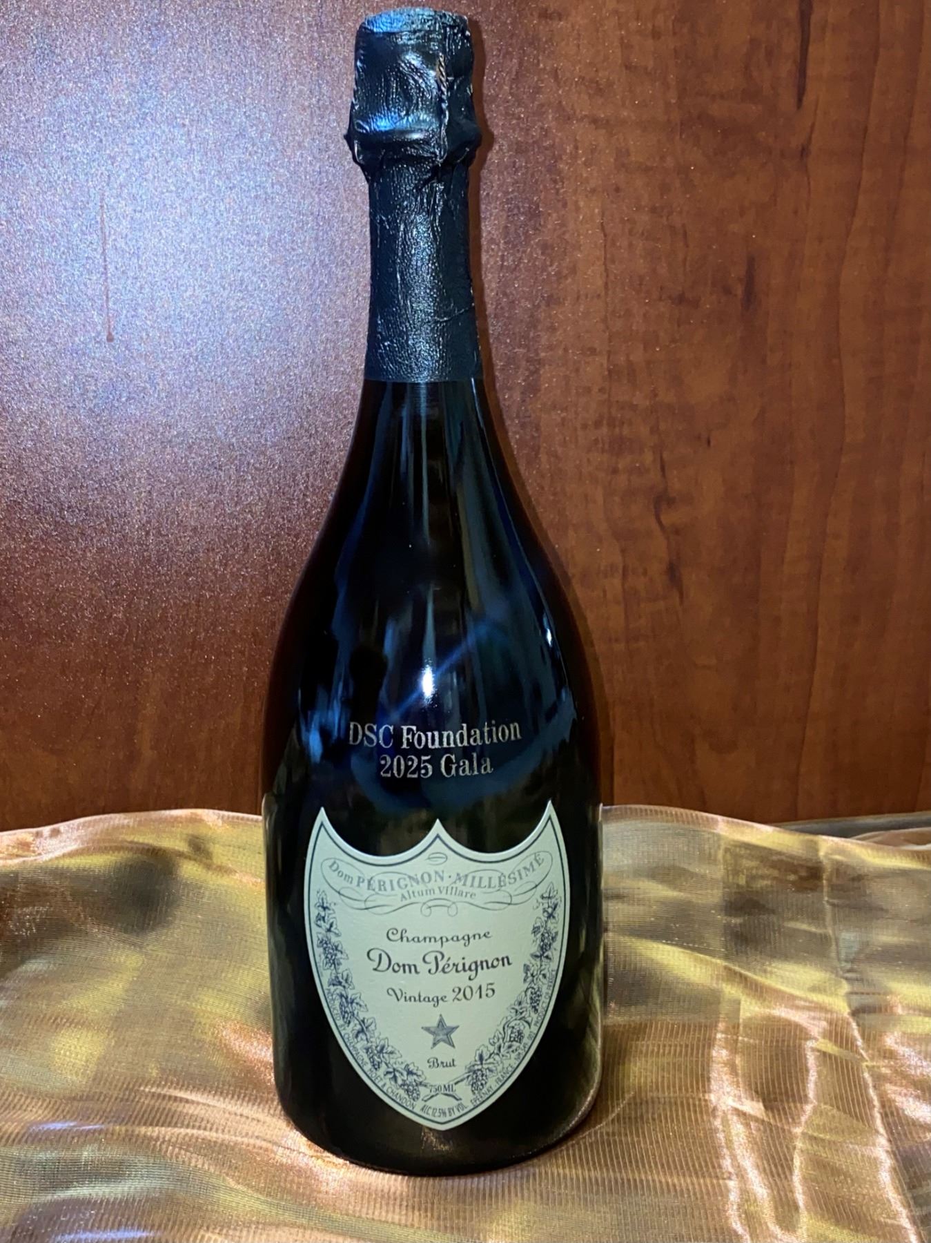 IN ROOM ONLY BIDDING: Dom Perignon Champagne engraved with 'DSC Foundation 2025 Gala'. This exquisite champagne is renowned for its exceptional quality and prestigious heritage, making it the perfect choice for celebrating life's most memorable moments. The bottle itself is a work of art, with its iconic shield label and sleek design. The deep green glass and the elegant black foil wrapping exude luxury and refinement, making it a stunning centerpiece for any occasion. DSC FOUNDATION THANKS RUSSELL & MARY EDITH STACY FOR THIS 100% DONATION.