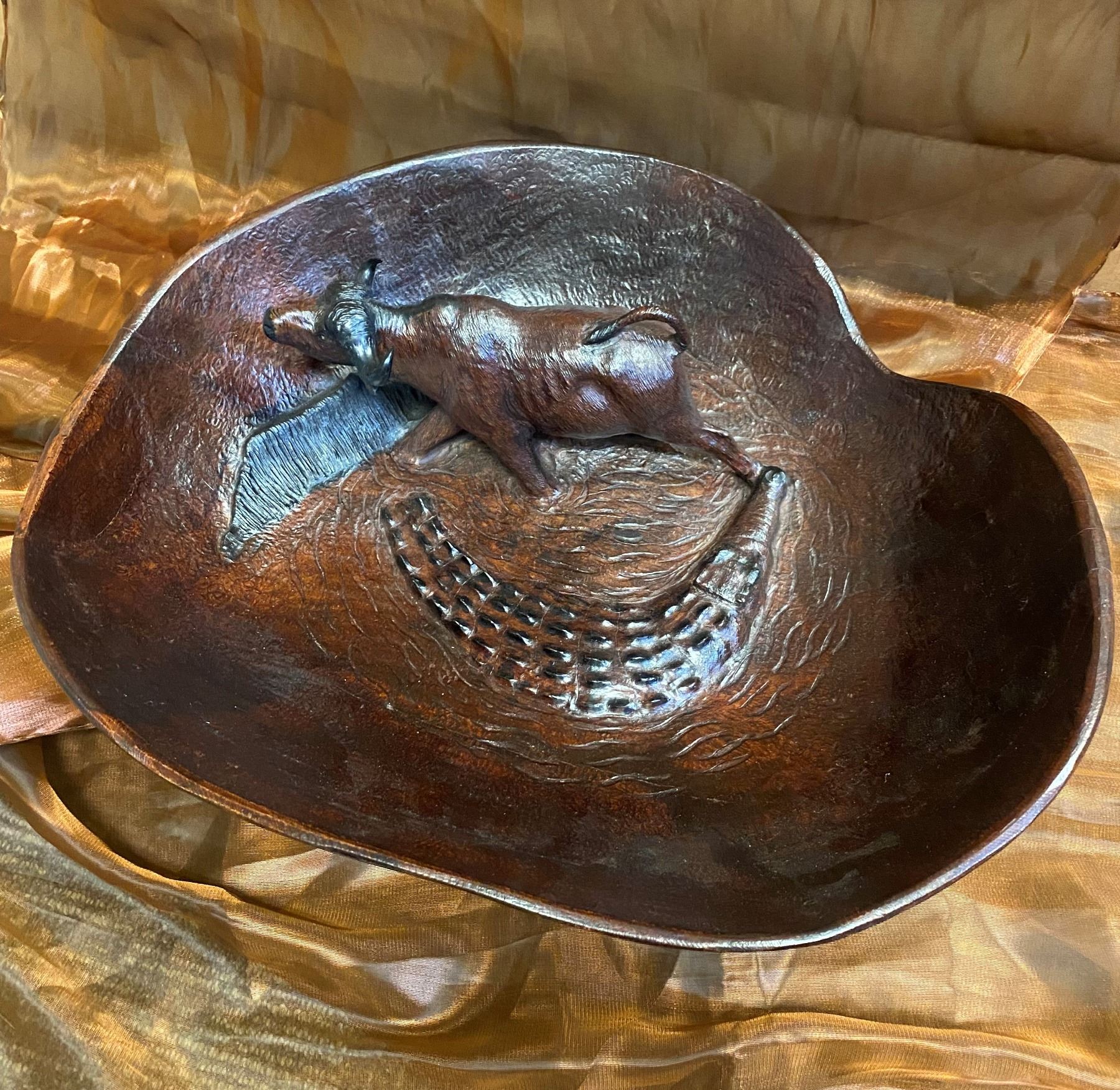 Lot 136 RUSSELL & MARY EDITH STACY: Oversized Wood Display Bowl w/Hand Carved Cape Buffalo and Crocodile