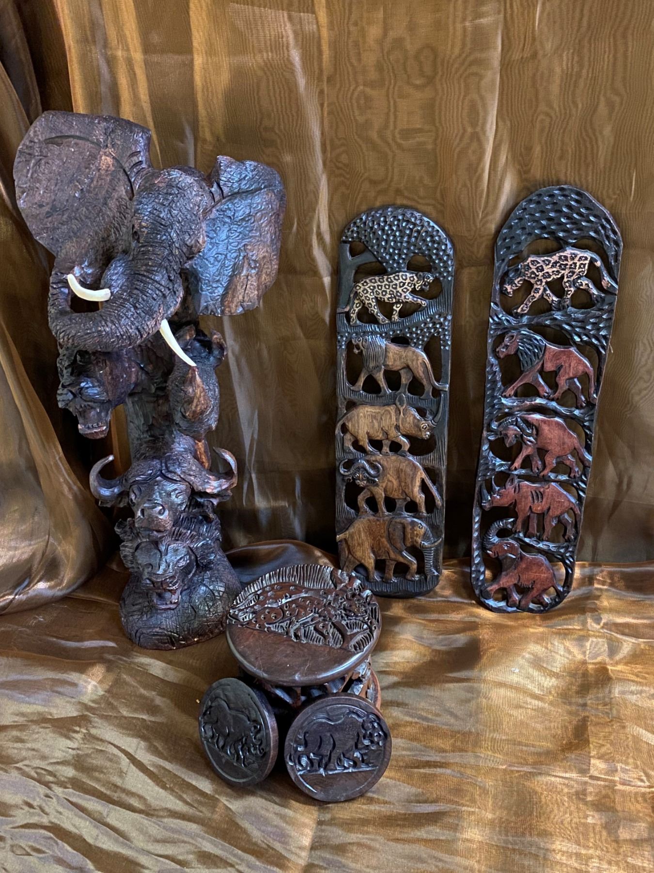 Hand carved Big Five household accessories. Set includes tower table display, two (2) wall panel displays and coasters with holder, all featuring the African Big Five. DSC FOUNDATION THANKS RUSSELL & MARY EDITH STACY FOR THIS 100% DONATION.