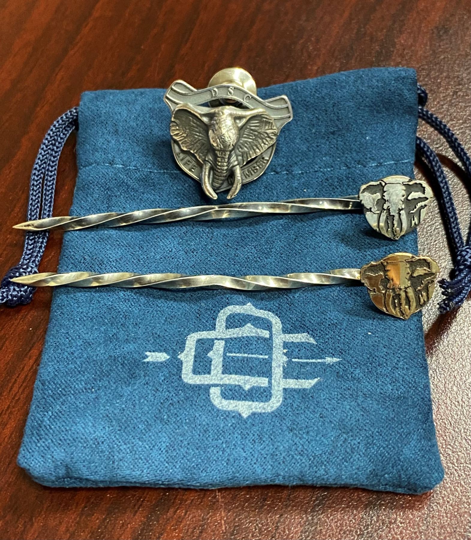 Custom engraved DSC Life Member lapel pin and set of two hat picks by Clint Orms. The DSC Life Member lapel pin is engraved in sterling silver with a 3D elephant. The hat picks are engraved in one of each sterling silver and 14k yellow gold and measure 3". DSC FOUNDATION THANKS RUSSELL & MARY EDITH STACY FOR THIS 100% DONATION.