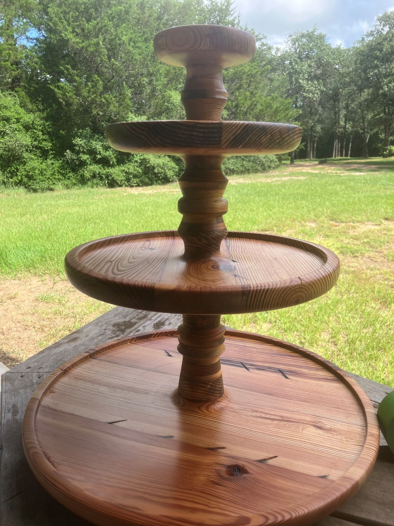 One-of-a-kind, handcrafted 3-tier wood serving stand turned by Jim Rose, USAF Retired. This gorgeous server was crafted using salvaged wood from a demoed historic home in Rosanky, Texas. Own a piece of Texas history and craftsmanship with this unique piece. DSC FOUNDATION THANKS ROSE WOOD WORKING AND BEE FARM FOR THIS 100% DONATION.