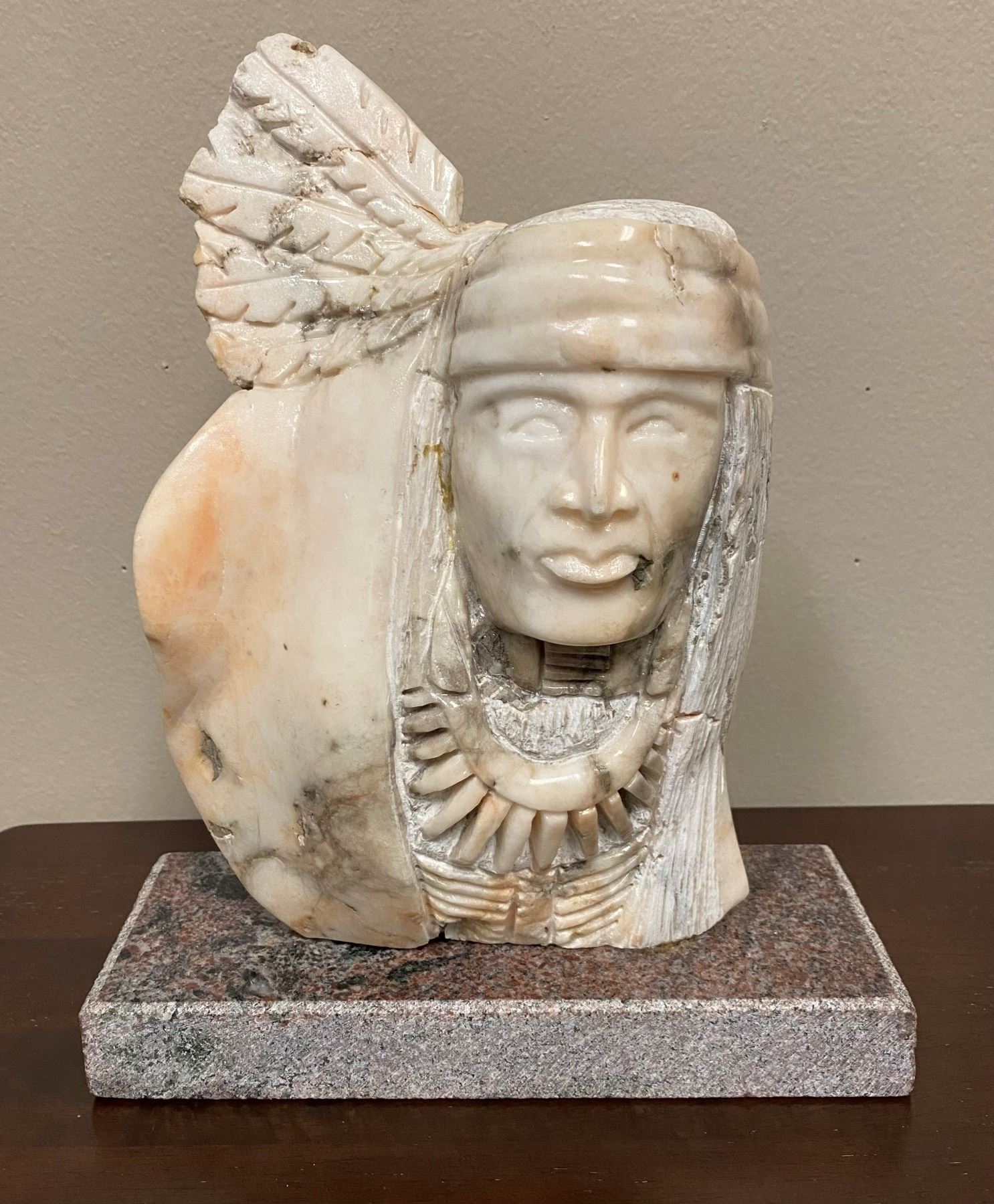 Indian alabaster sculpture by Native American artist Mike Toledo, measure 16" in length. Mike Toledo is a young Navajo sculptor from Kirtland/Fruitland, New Mexico. He has established himself as a sensitive portrayer of Native American themes in alabaster, among other stone materials. DSC FOUNDATION THANKS HAYDEN OUTDOORS / ROBERT ESPINOZA SR. FOR THIS 100% DONATION.