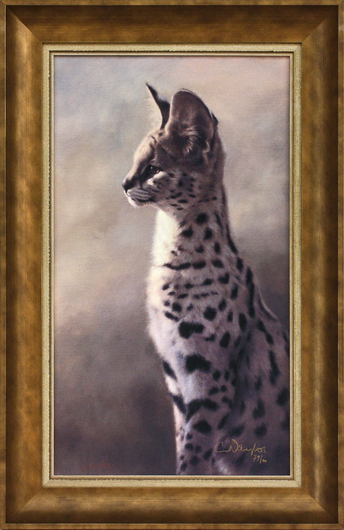 "Serval Sentry" - Stunning and beautifully framed limited edition #79/99 giclee print on canvas of a serval by British wildlife artist, Claire Naylor. Measures 32"x22" framed. DSC FOUNDATION THANKS FRIEND OF DSCF FOR THIS 100% DONATION.