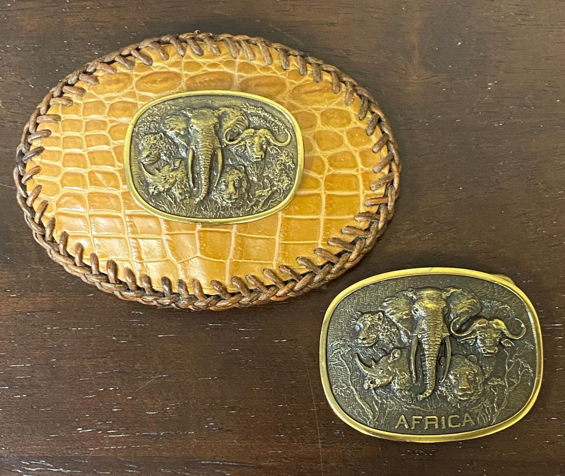 His & hers Big Five belt buckles. His belt buckle is made out of crocodile leather with a solid brass Big Five plate on top. Her belt buckle is solid brass with the word "AFRICA" underneath the Big Five. Both buckles are brass electroplated, then brushed and lacquered. DSC FOUNDATION THANKS BRIAN FIENHOLD FOR THIS 100% DONATION.