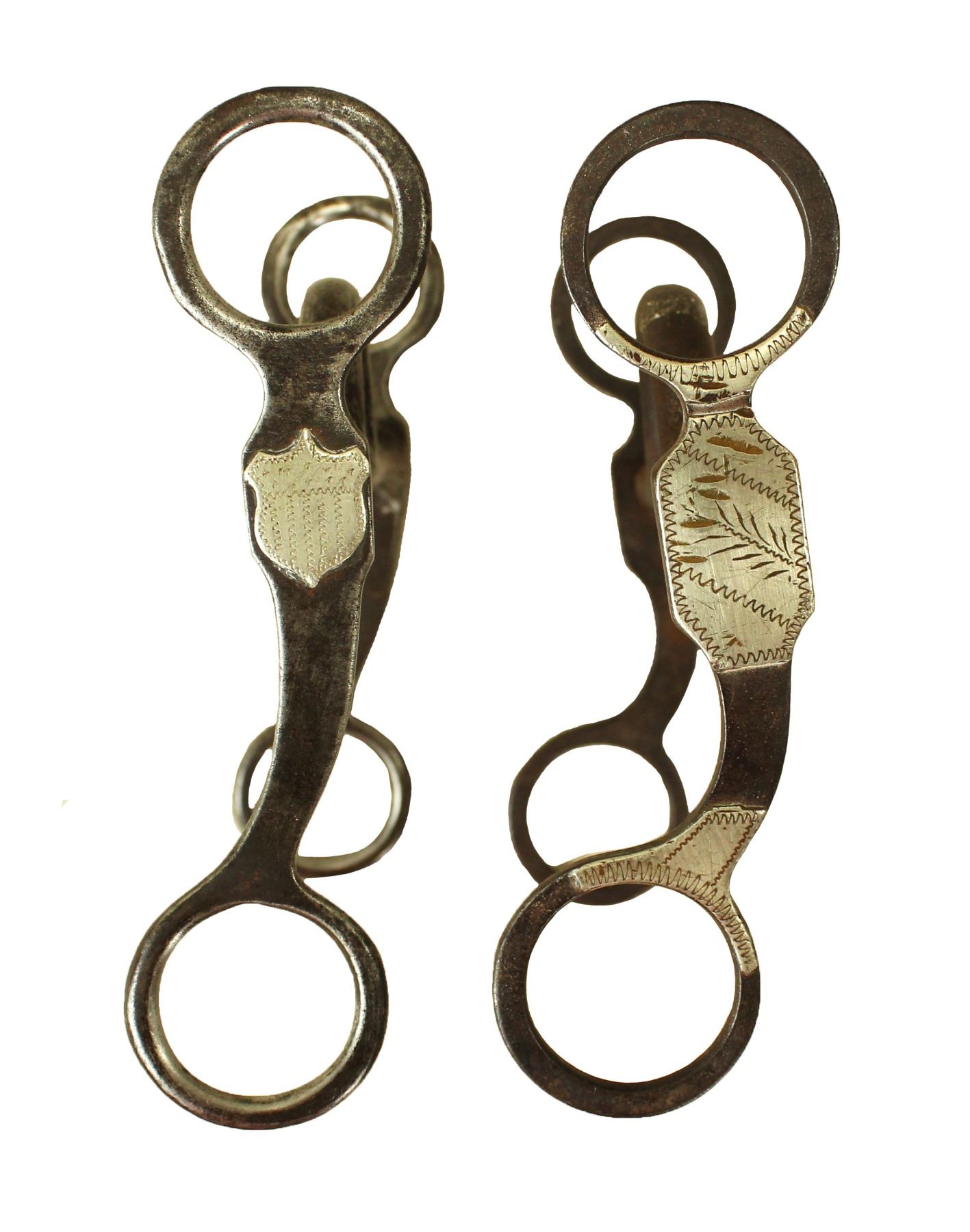 A pair of Texas style iron silver mounted grazing bits, one well marked Crockett, and a highly desired McChesney shield bit.