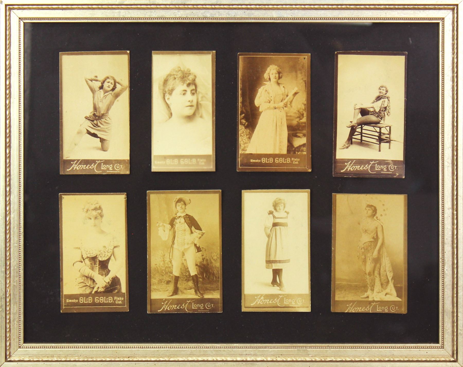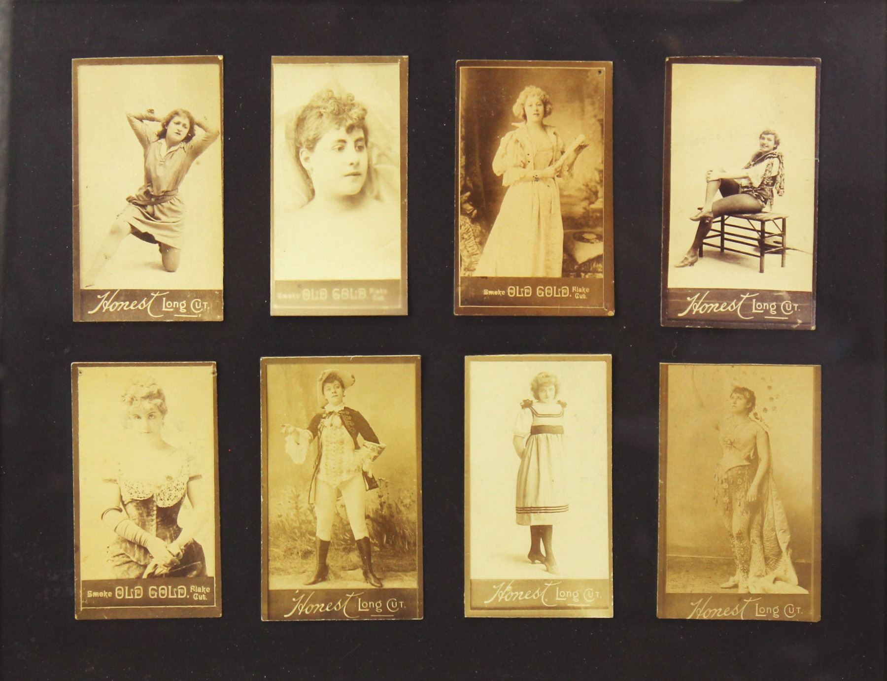 Framed collection of tobacco cards with early "erotic women" in various poses.