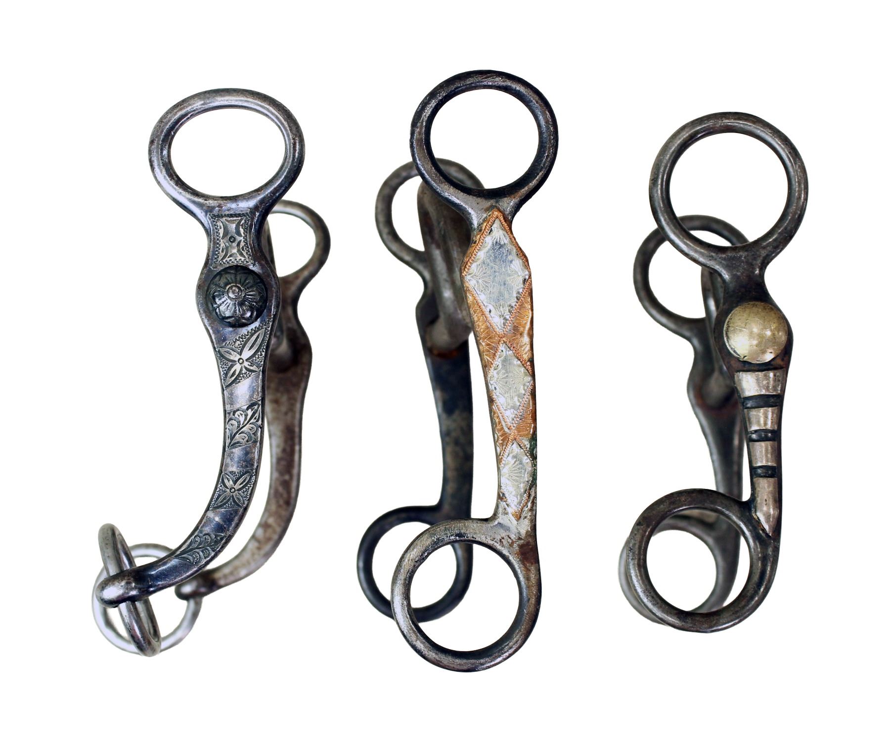 Three attractive short shank grazing bits; 1) A beautiful silver inlaid Buerman with early Star AB marking. 2) A nicely marked bit by York with two tone overlaid diamond motif shanks. 3) An interesting silver overlaid North and Judd style bit with a tall mouthpeice.