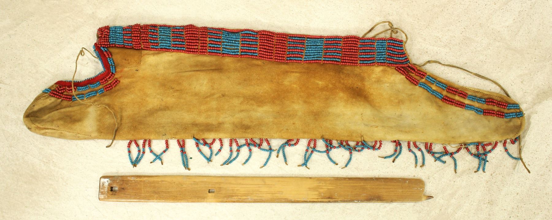 A 19th century Blackfoot Indian buffalo hide quiver, trimmed in pony style glass beads, showing great age and color.