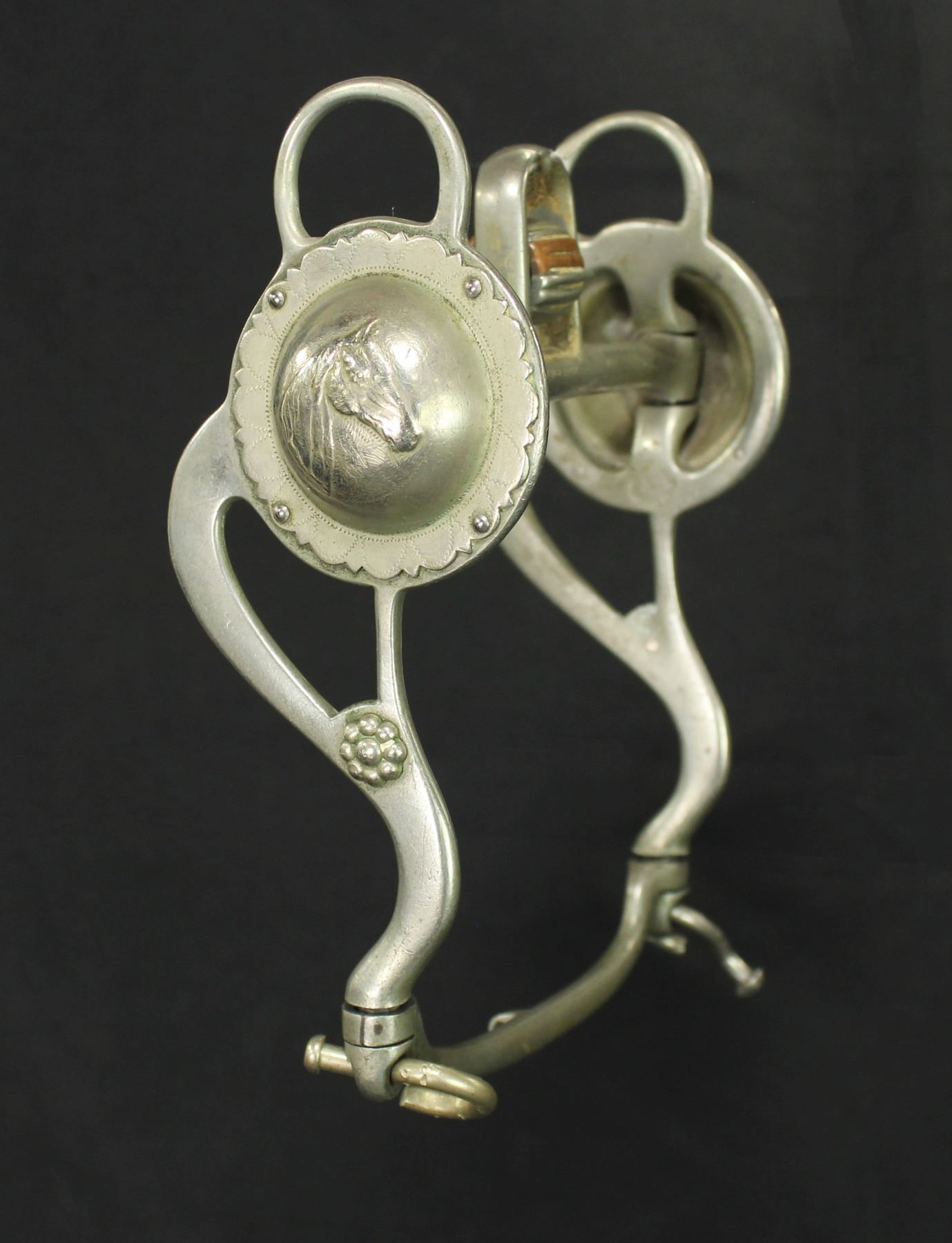 Characteristic 1930's-1940's decorative bit known as the "Humane Bit", with large horsehead embossed scalloped conchos.