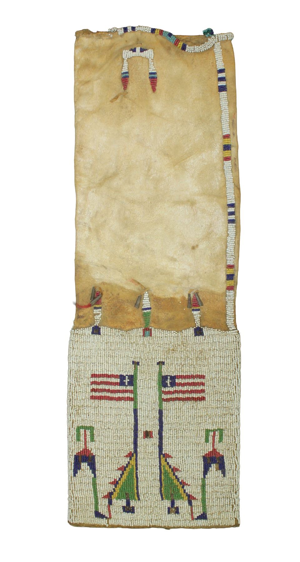19th Century Northern Plains pipe bag with desirable American Flag pattern on hide using colorful early beads. Measuring 20"x 7".