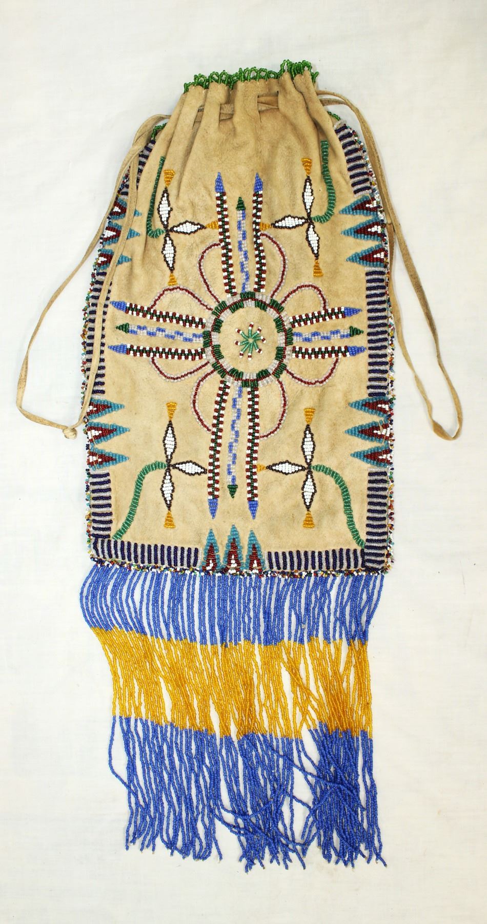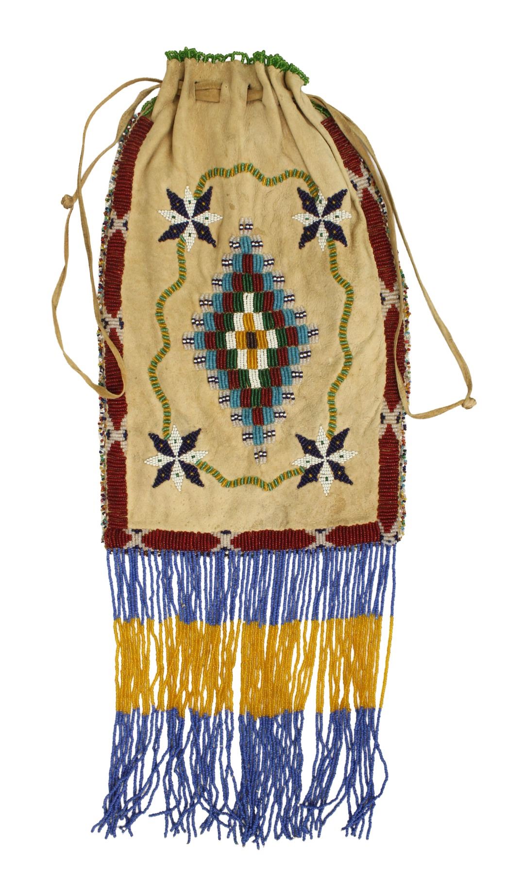 Oversized Southern Indian beaded bag with Vallejo Star pattern adorned by long beaded fringe.