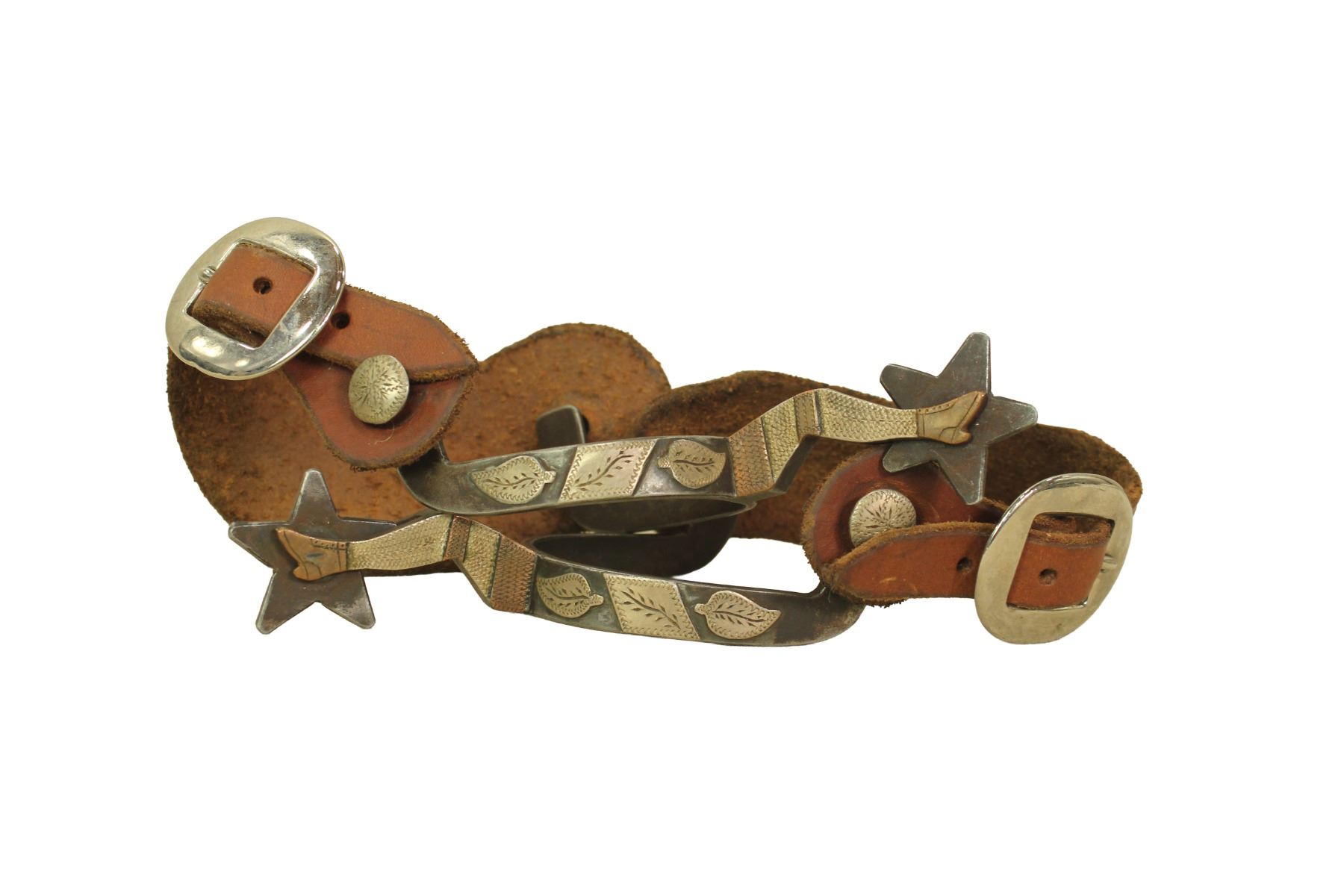 Well done pair of single mounted spurs in a two-tone lady leg pattern, and five point star rowels.