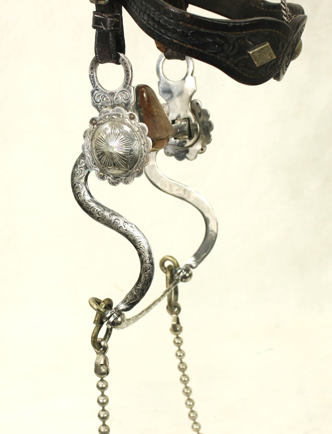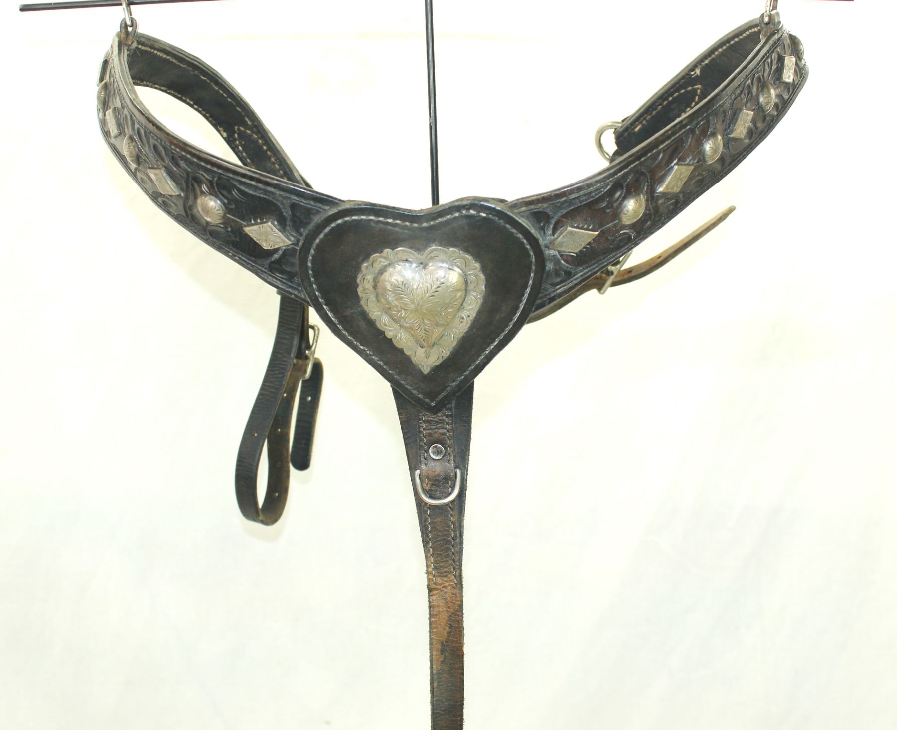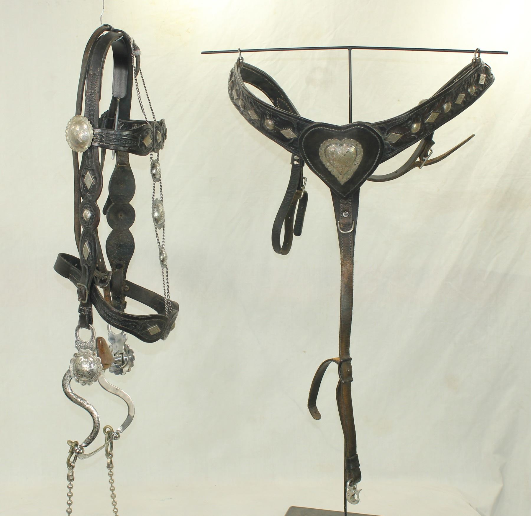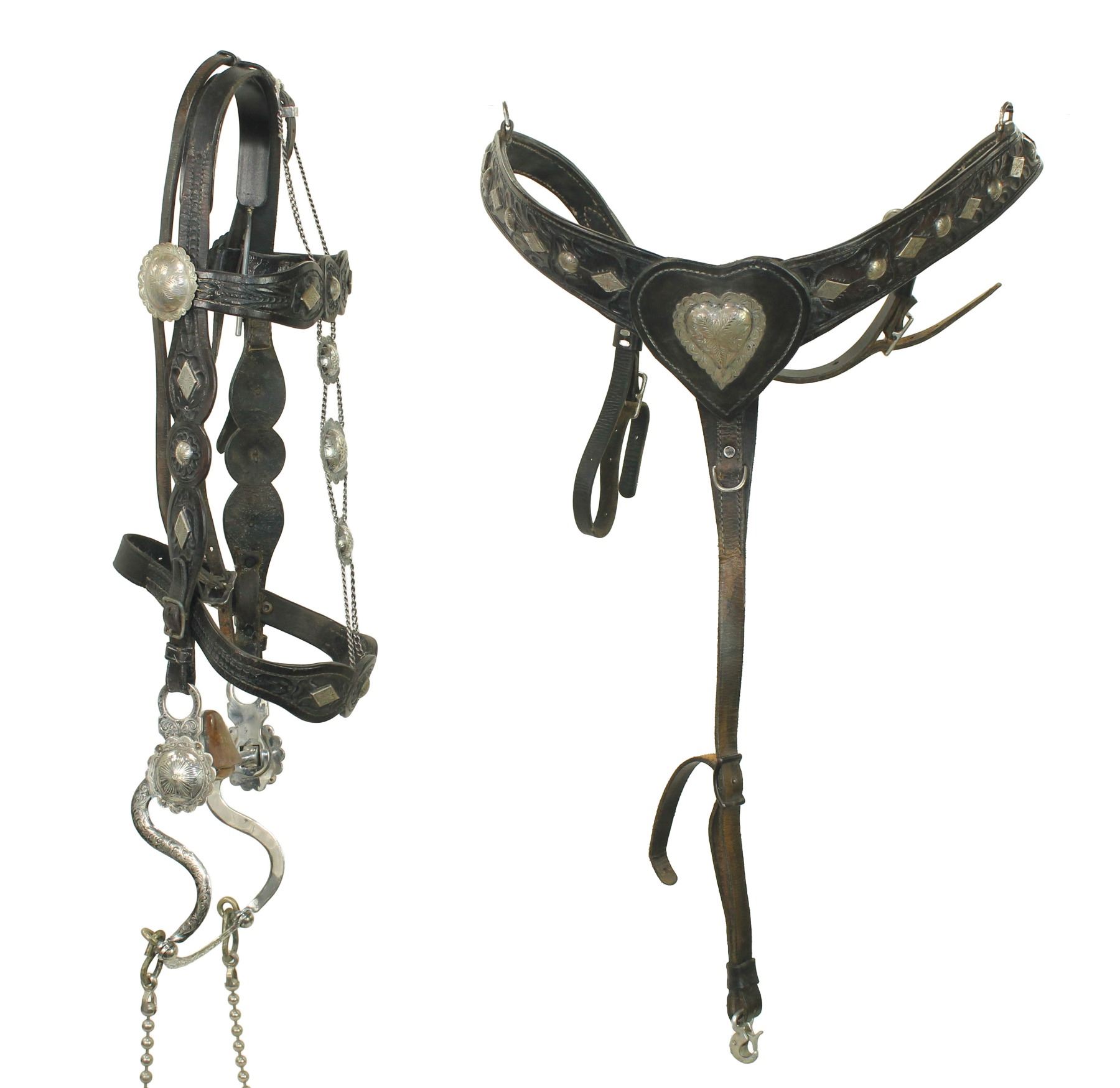 Seldom seen bridle and breast collar set from desirable maker, displaying stylish flower tooling accented with engraved silver mountings, with full face chain, silver heart center and completed by a stylish "S" shank bit.
