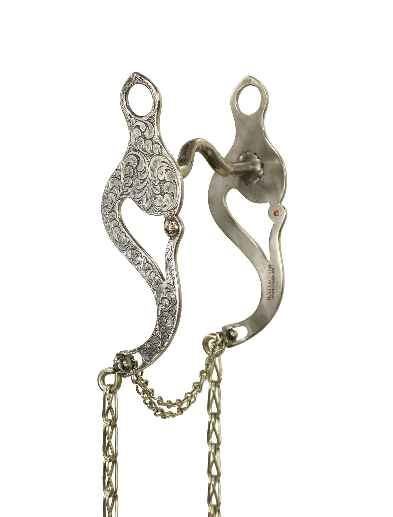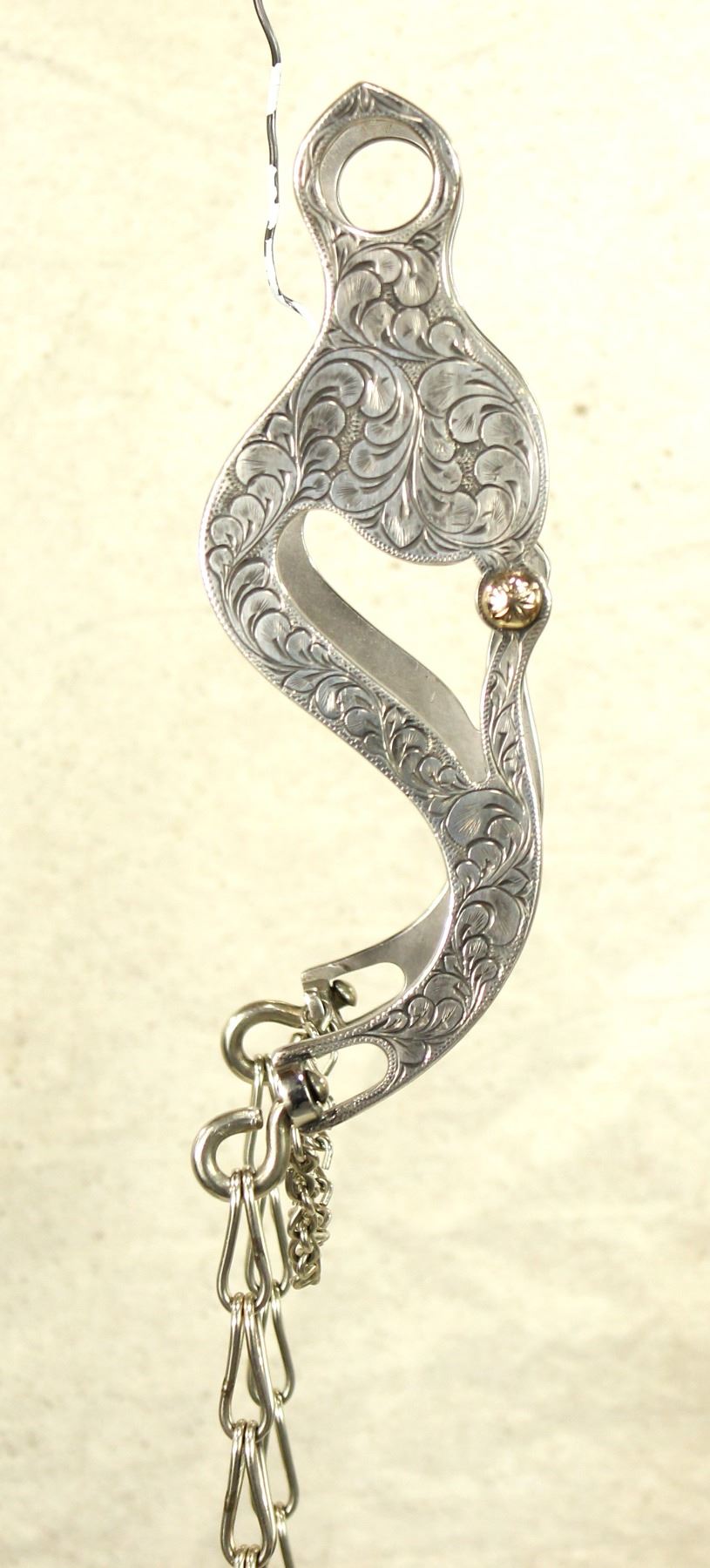 Elaborate fully silver mounted bit with intricate engraving accented by gold domes, port mouth piece, original rein chains,and maker's mark.