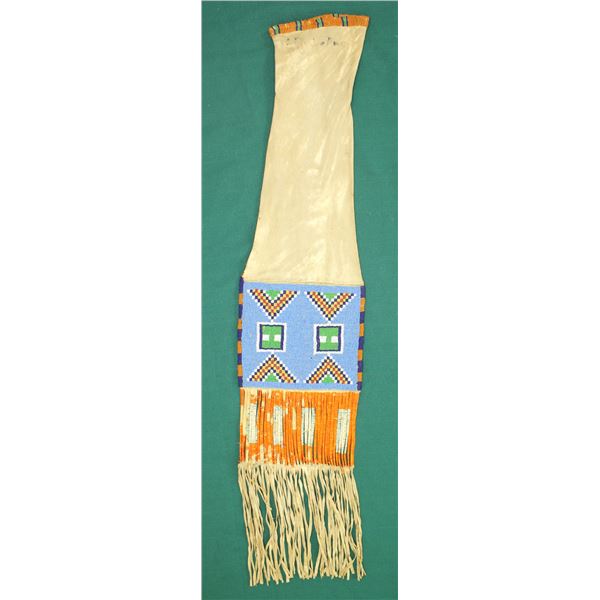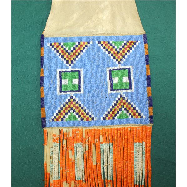 Wonderful Native American pipe bag, with very unique pattern beaded on hide, with attractive appearance and color. Measures 35"x 8".