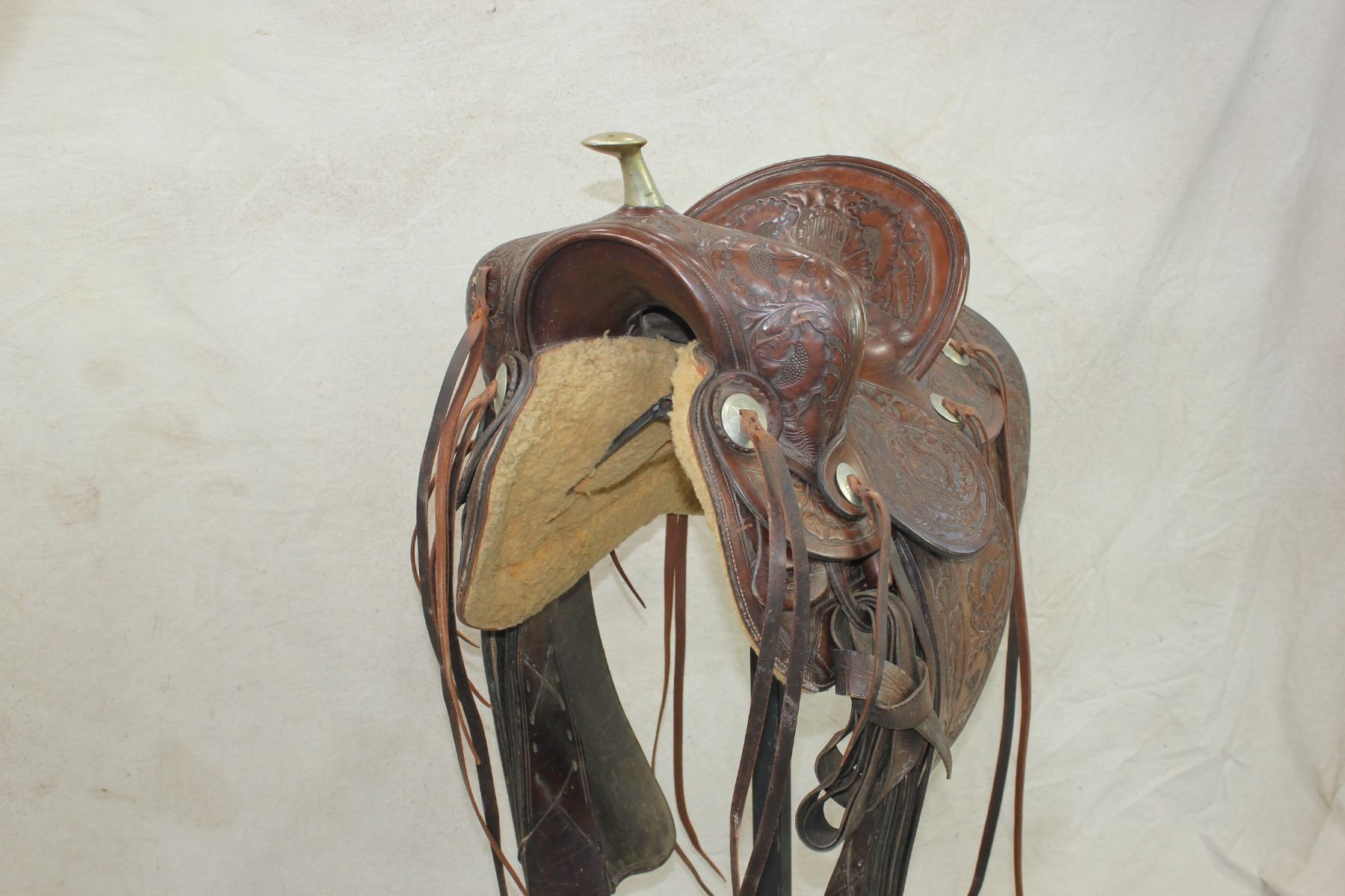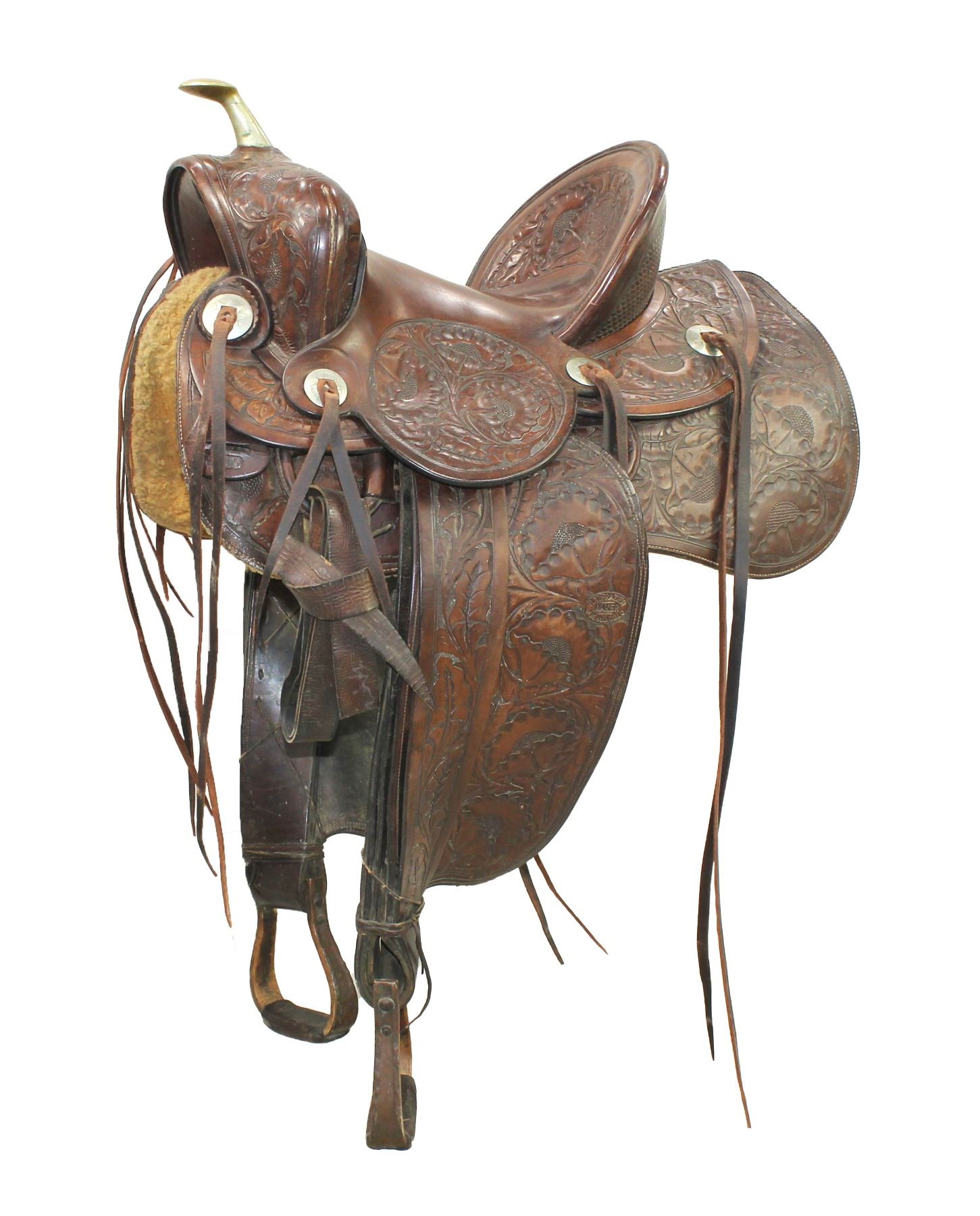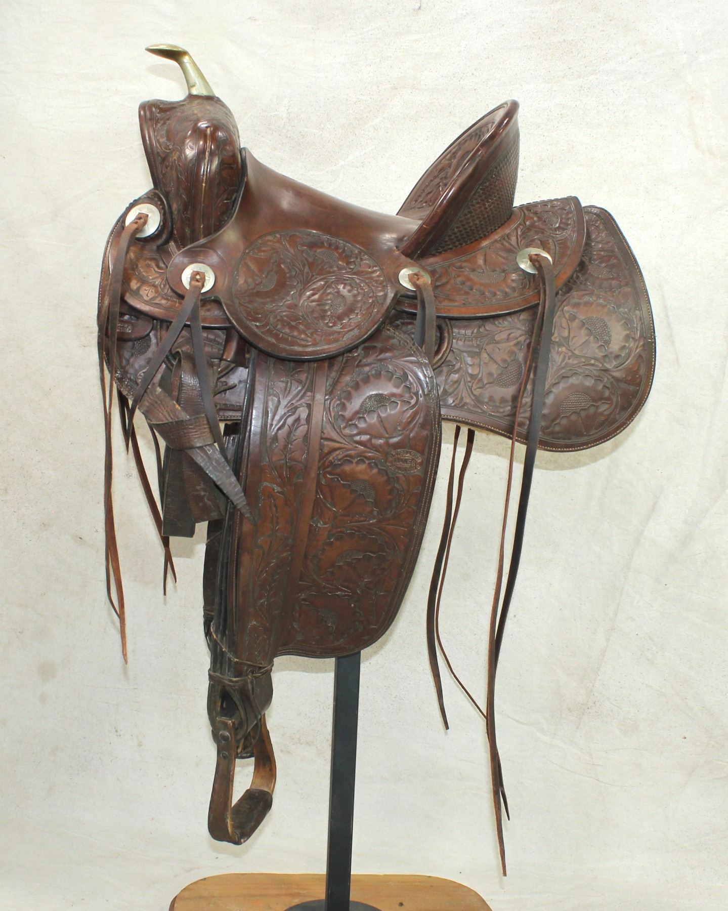 This terrific 1920's period saddle is in near mint condition and shows an uncommon large scalloped skirt, is fully flower tooled and accented by a nickel horn and conchos. With a great profile, seat measuring 14", and 5 1/2" tall cantle.