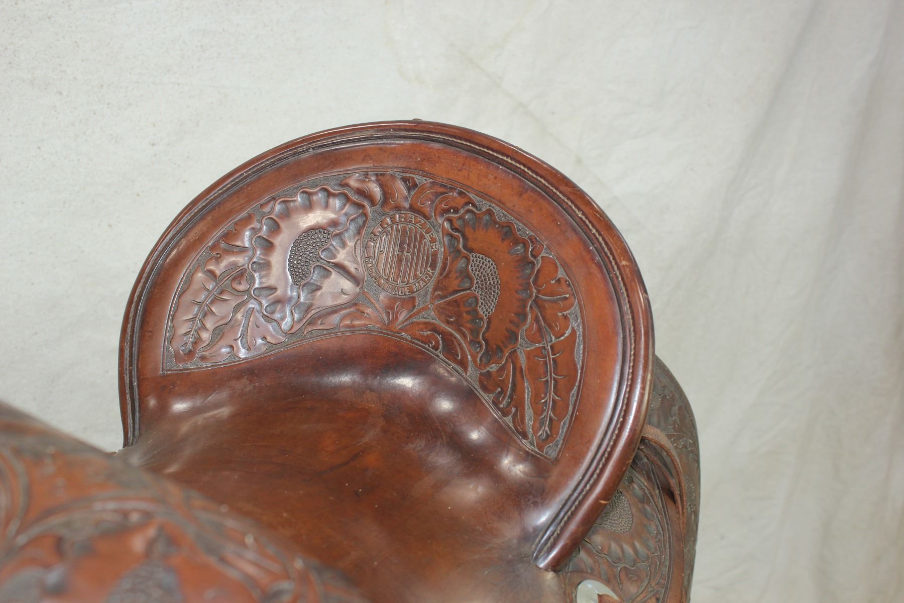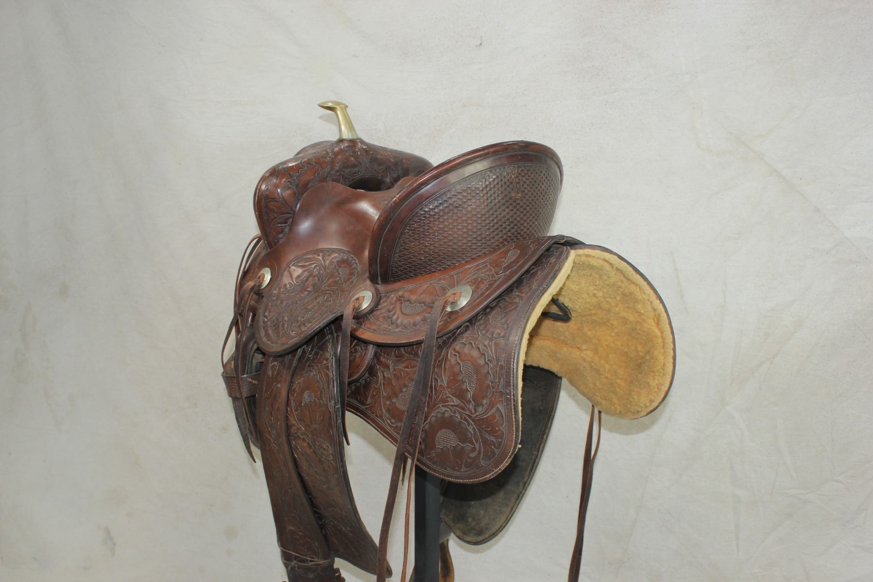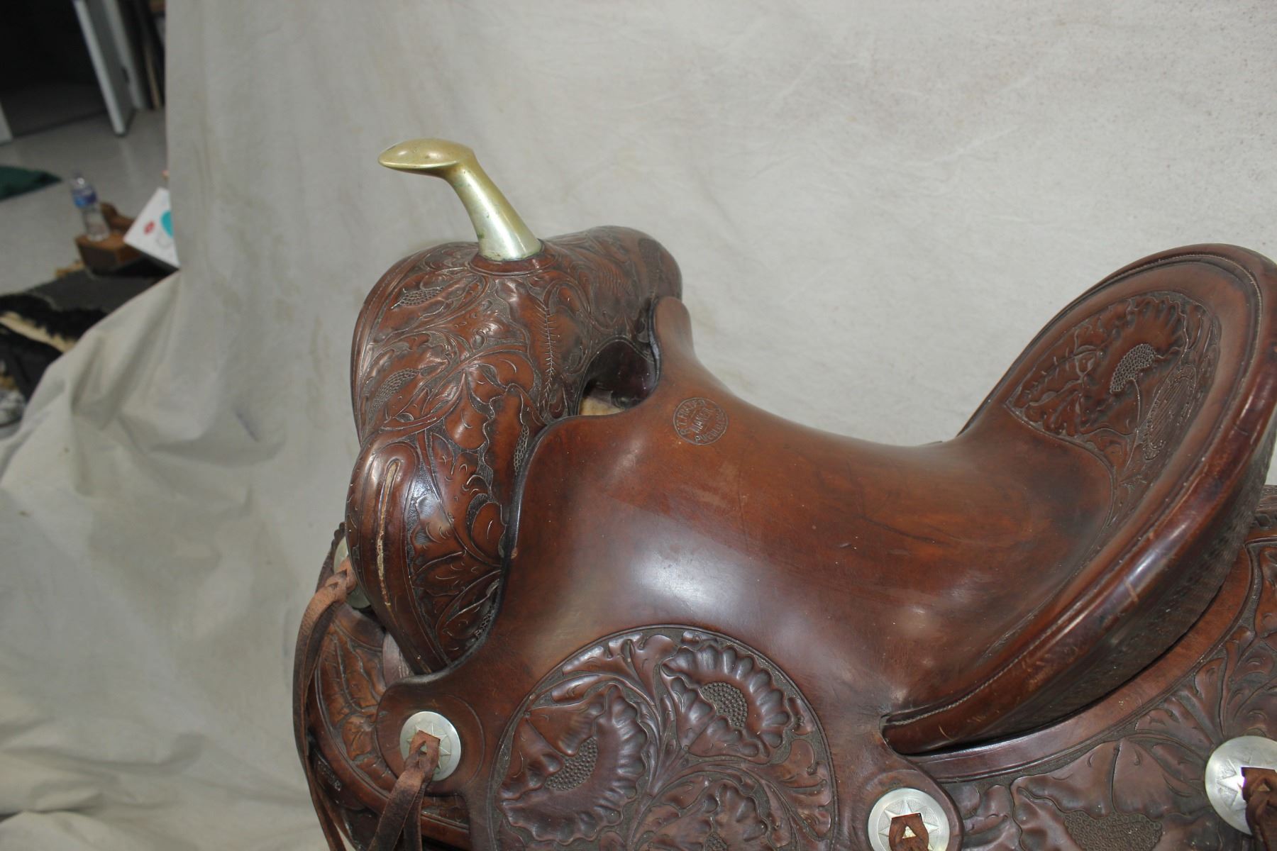 This terrific 1920's period saddle is in near mint condition and shows an uncommon large scalloped skirt, is fully flower tooled and accented by a nickel horn and conchos. With a great profile, seat measuring 14", and 5 1/2" tall cantle.