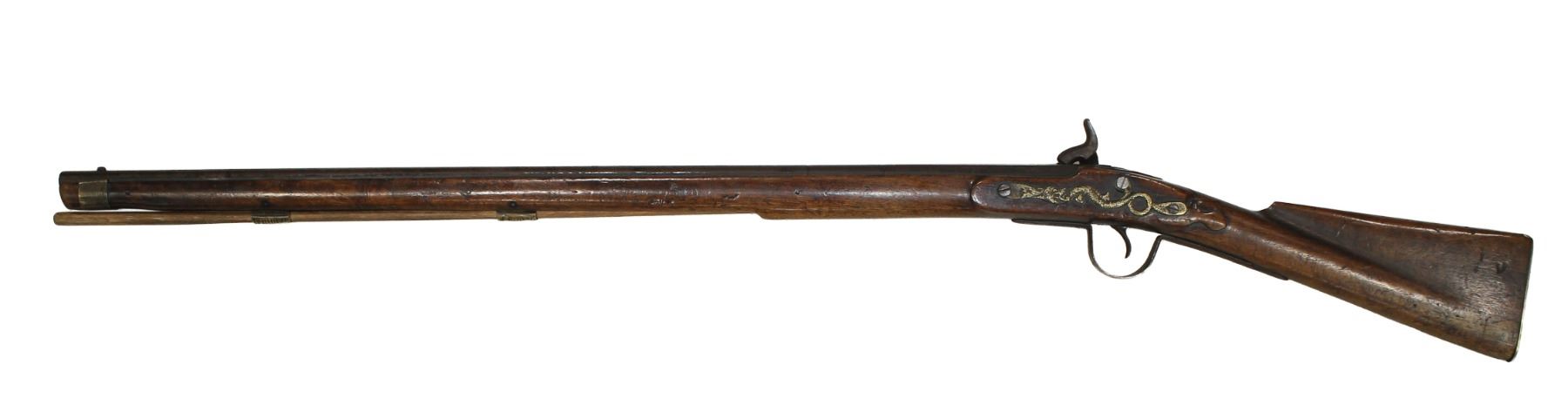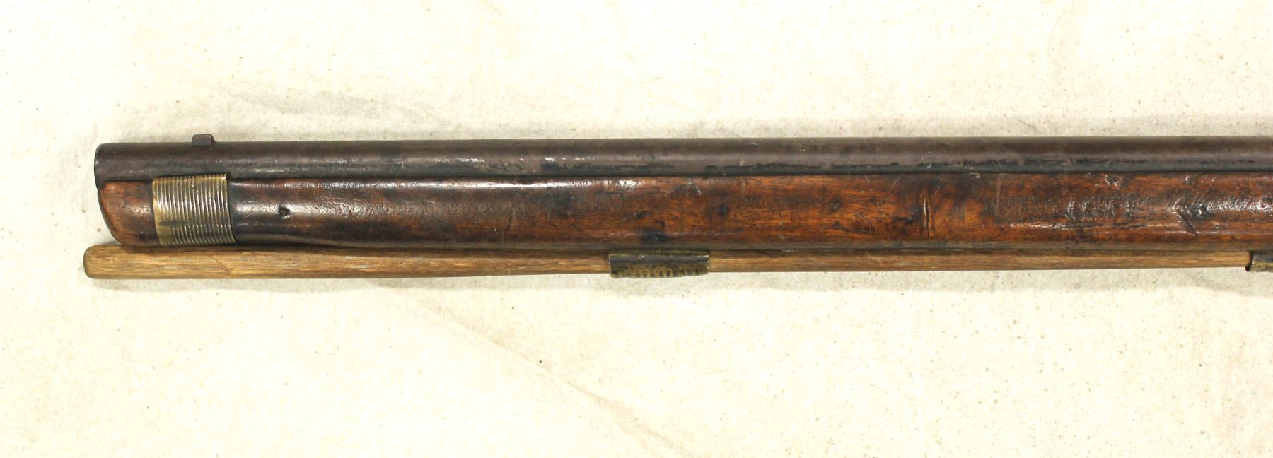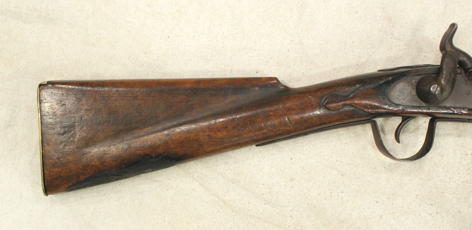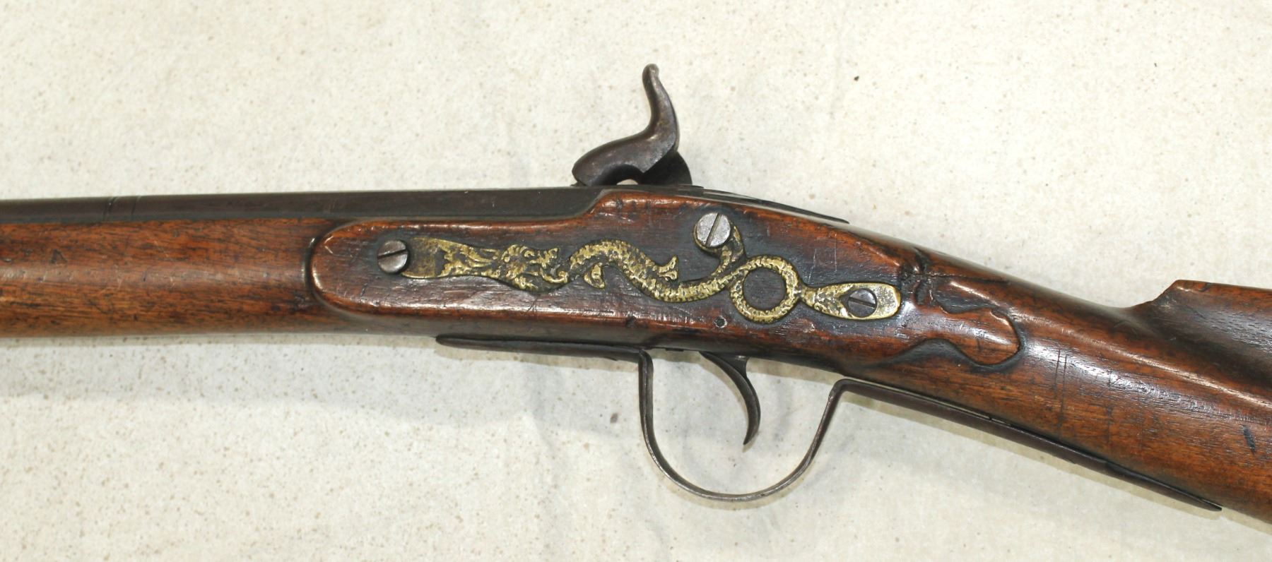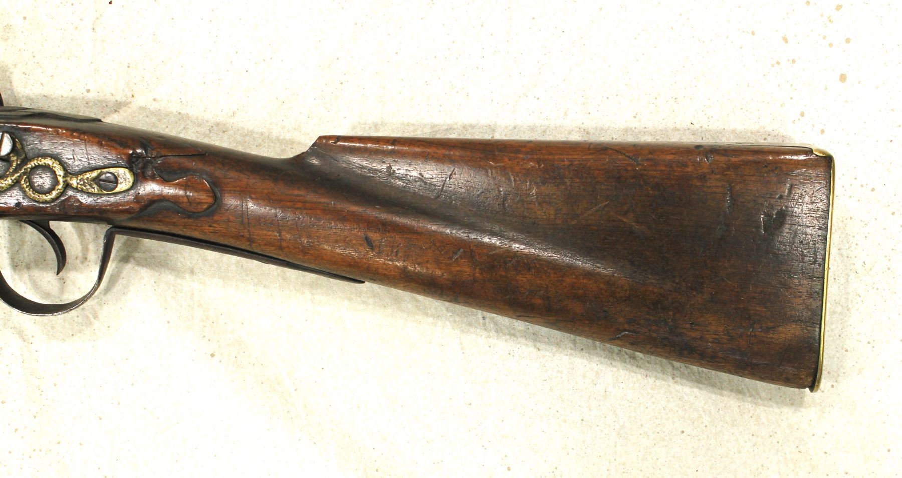 Very desirable rifle with brass serpent lock, circa 1861-1900. With a commonly shortened 36” barrel for horseback use, 52 caliber, and walnut stock. Displaying a small blade front sight, three stage barrel with transition bands, British proofs and “I Hollis & Sons at the center of the lock. Showing nice antique wear and use.
