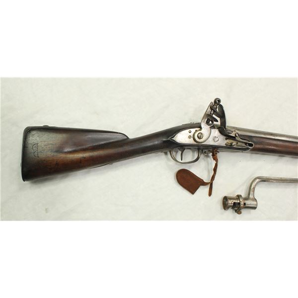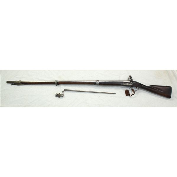 In the era of the War of 1812, 69 caliber, made in the style of the Model 1875. Correctly marked with a Federal Eagle , with all iron mounts, with overall metalwork being a lovely gray polished patina. With functional lock, and retaining its original ramrod and bayonet.