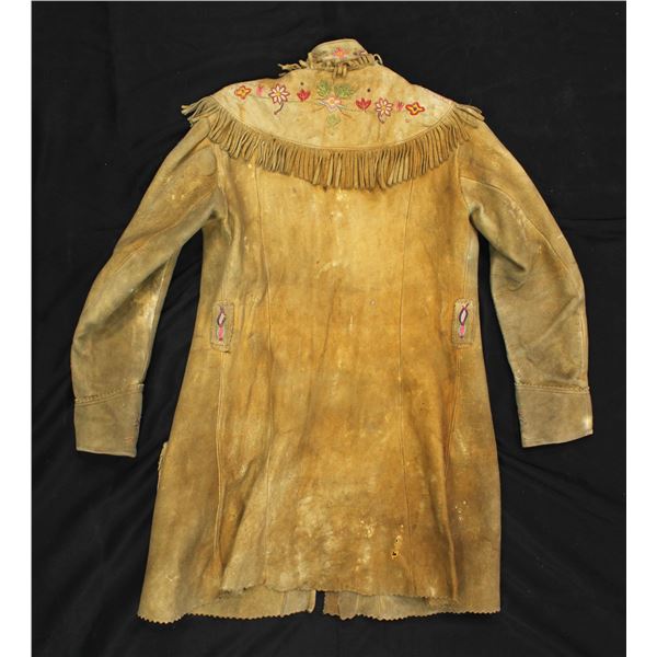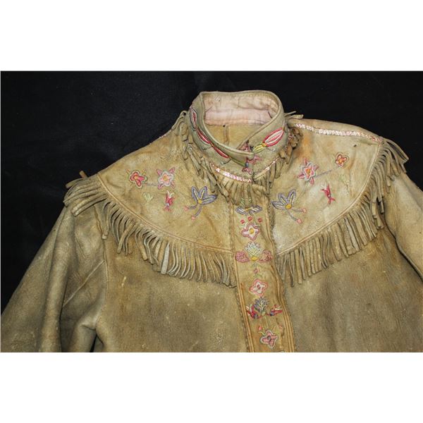 Beautifully designed Native American handcrafted buckskin jacket with great fringe, embroidered trim accented by quill work. In excellent period condition, with slight wear consistant with age, adding character to the garment. Circa 1890, and approximate size 42.