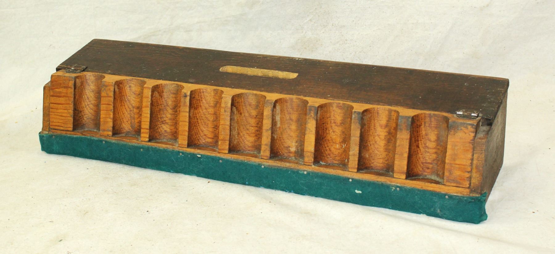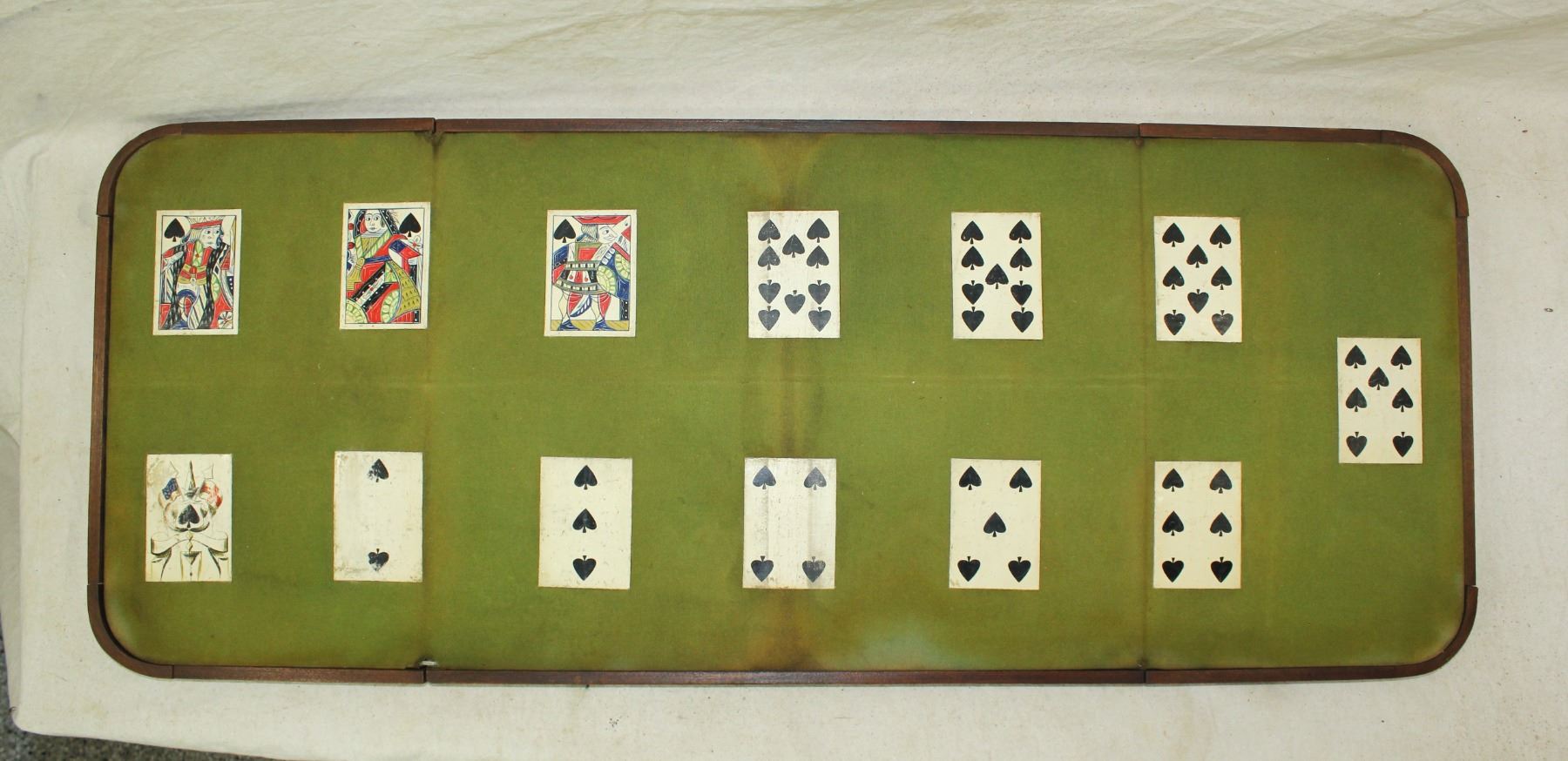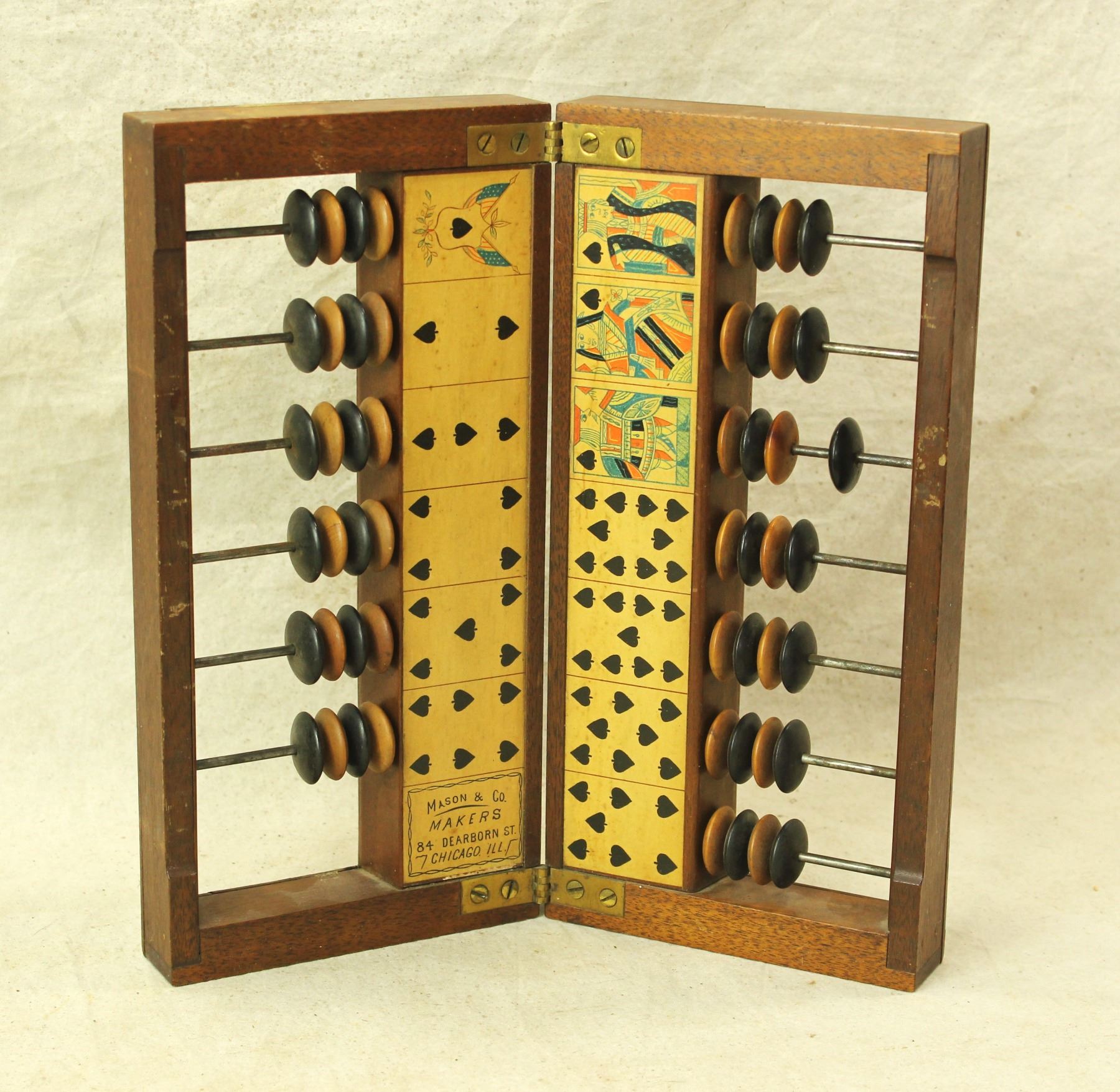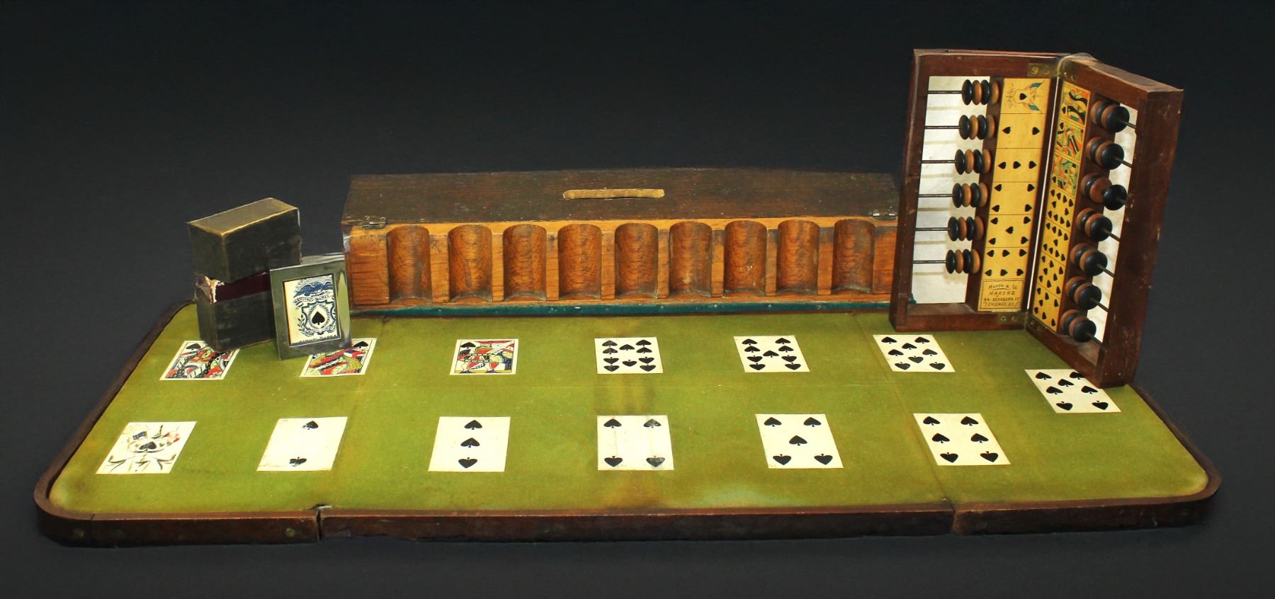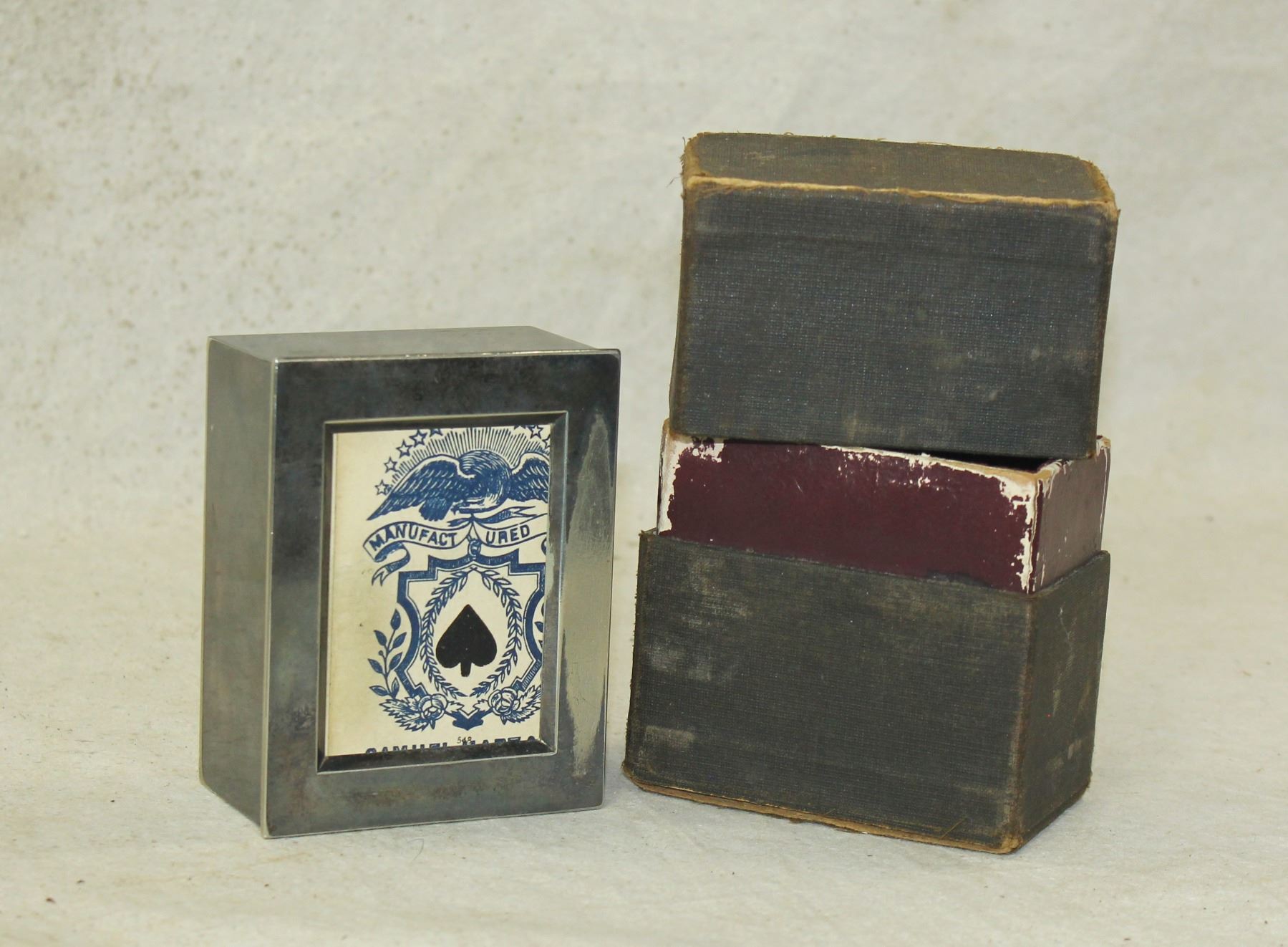 A wonderful offering of a complete grouping of antique gambling items that includes a felt top traveling Faro board, a Mason marked case keeper, long wooden chip rack, and beautiful silver playing card box.