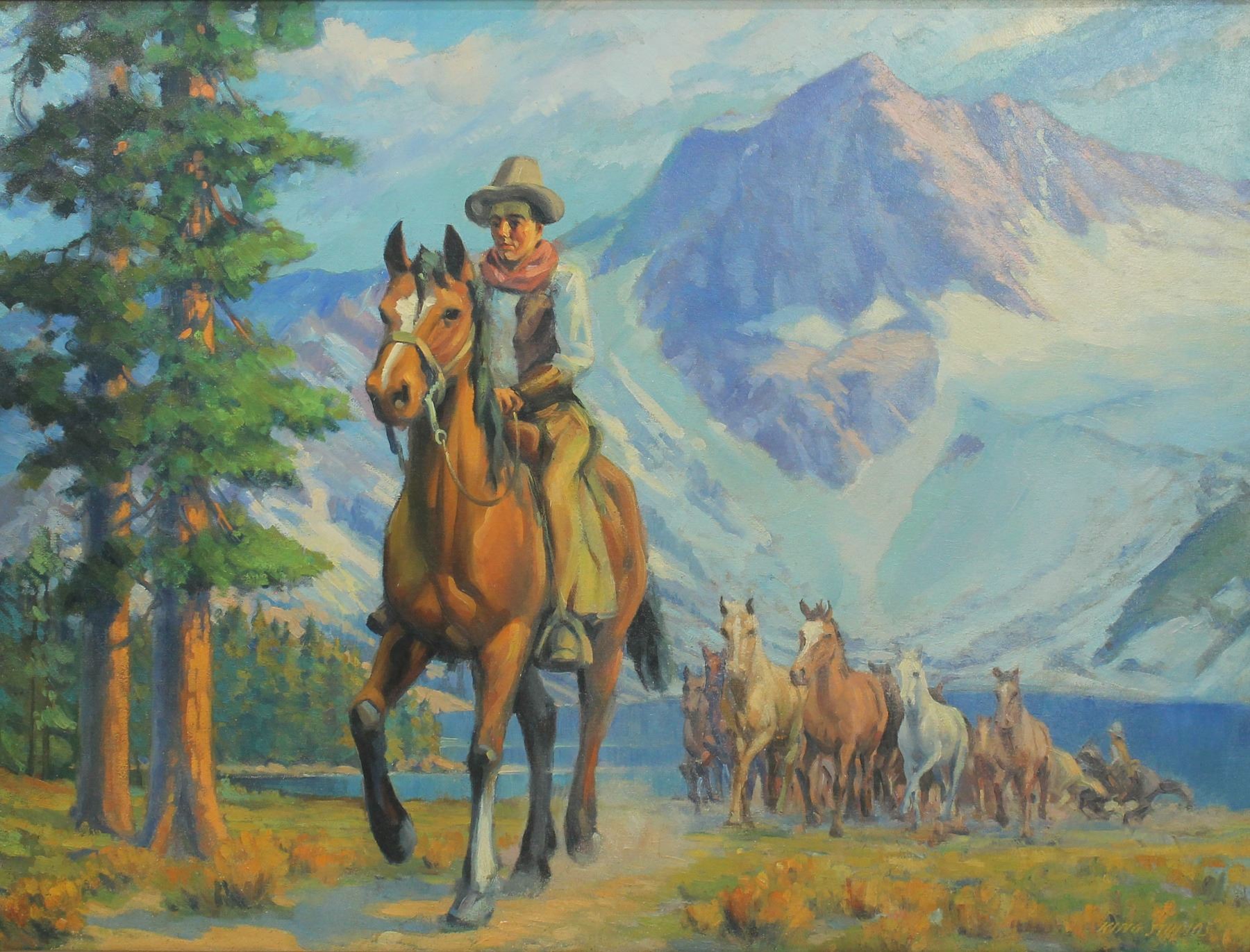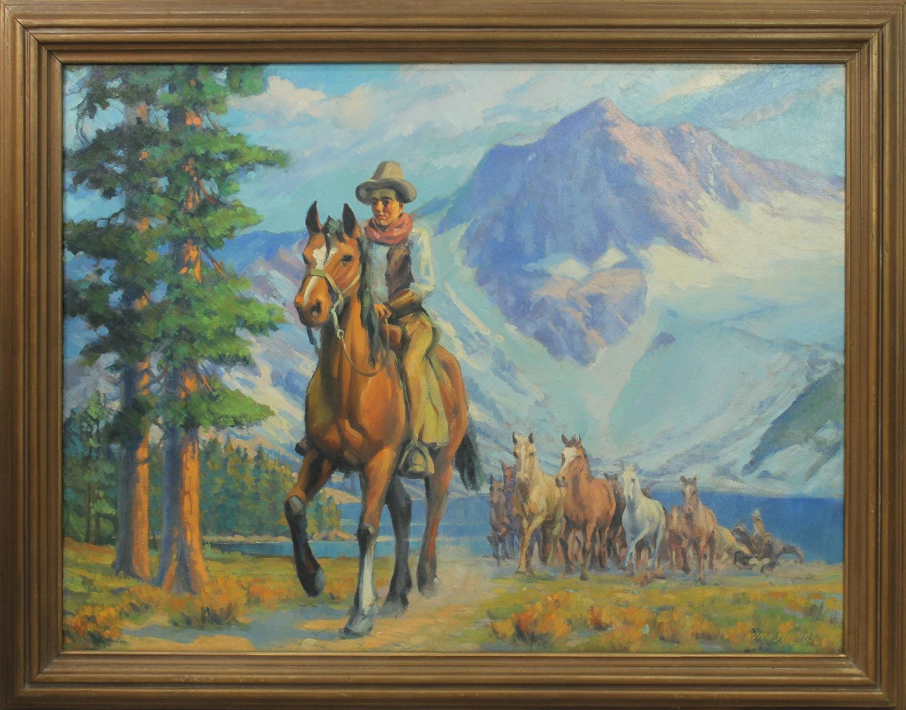 Attractive large western oil on canvas signed "King Studios" in lower right, displaying great color and western theme. Beautifully framed and measuring 55"x 43".