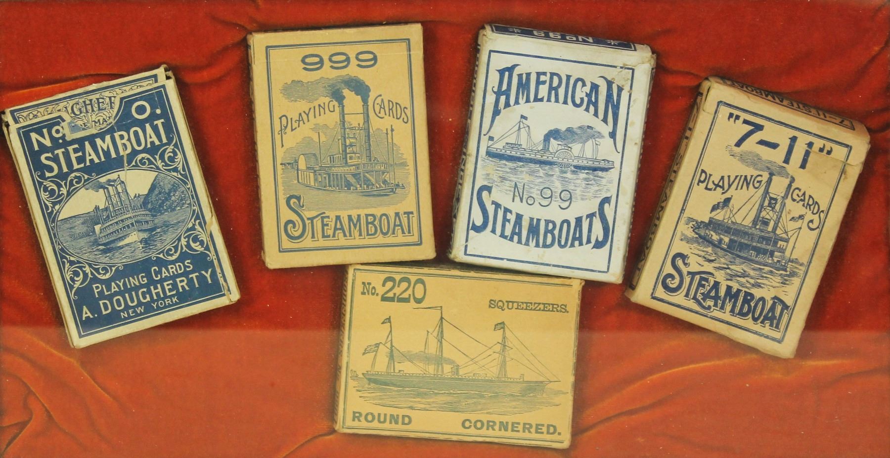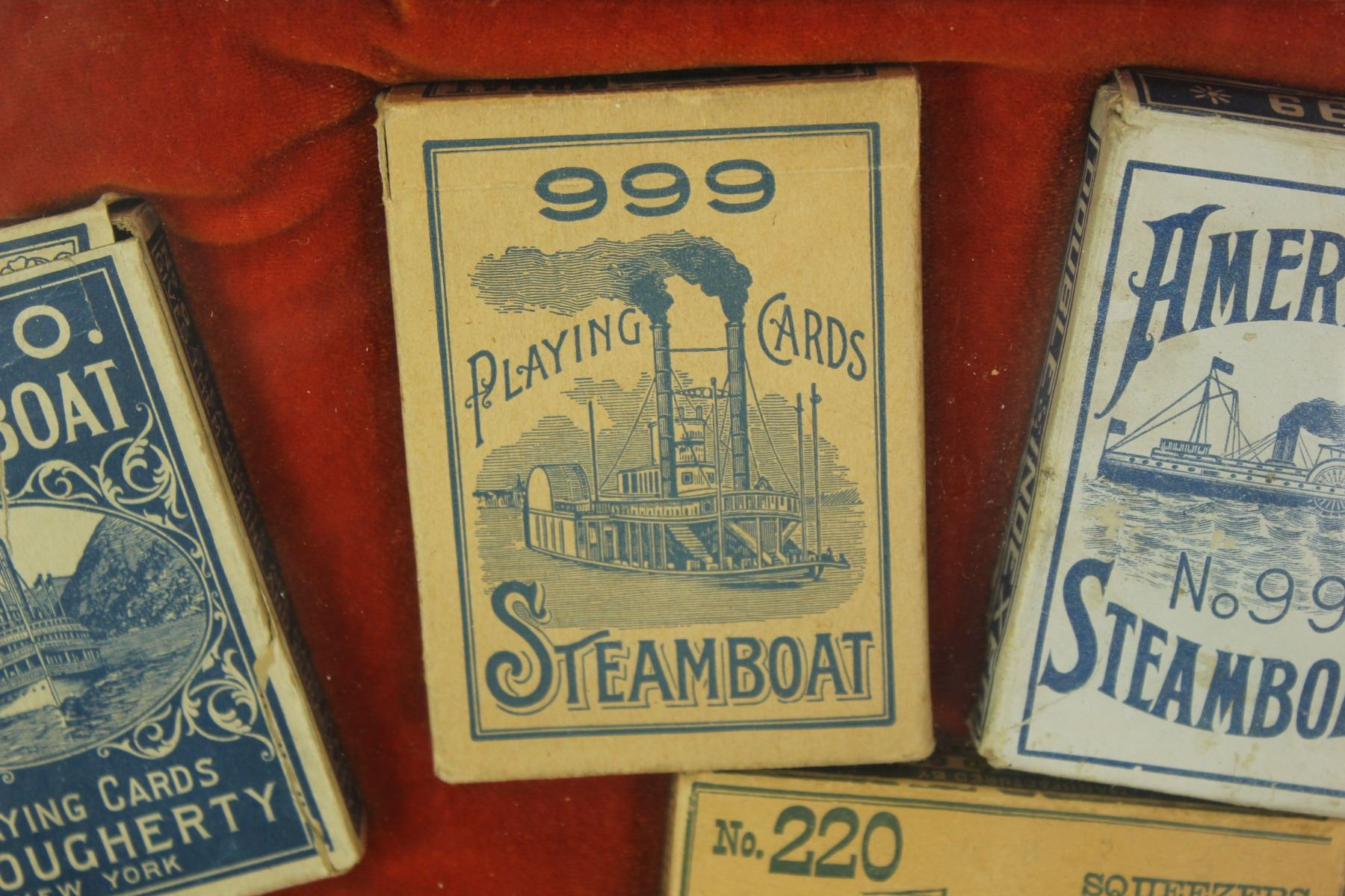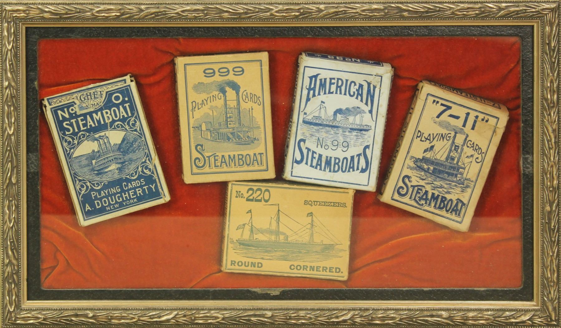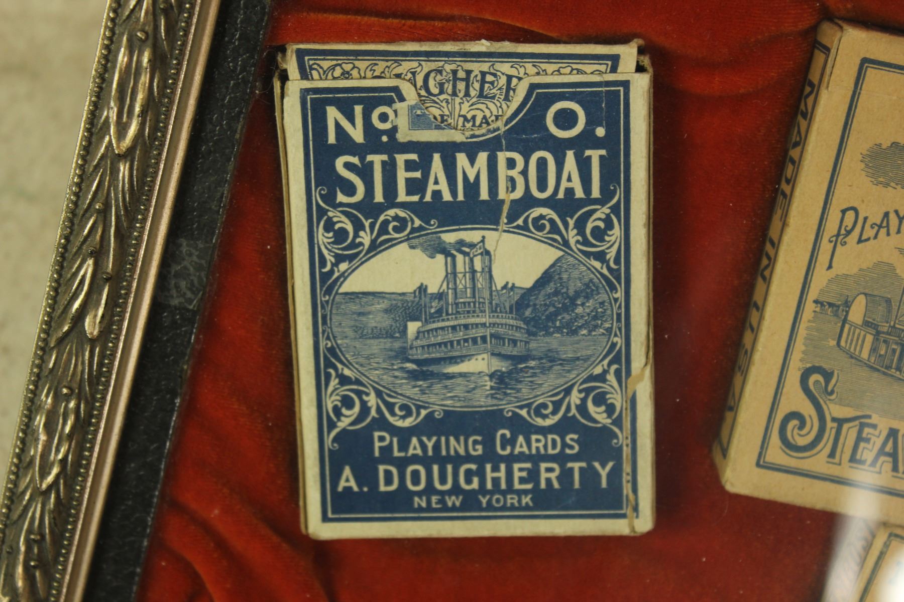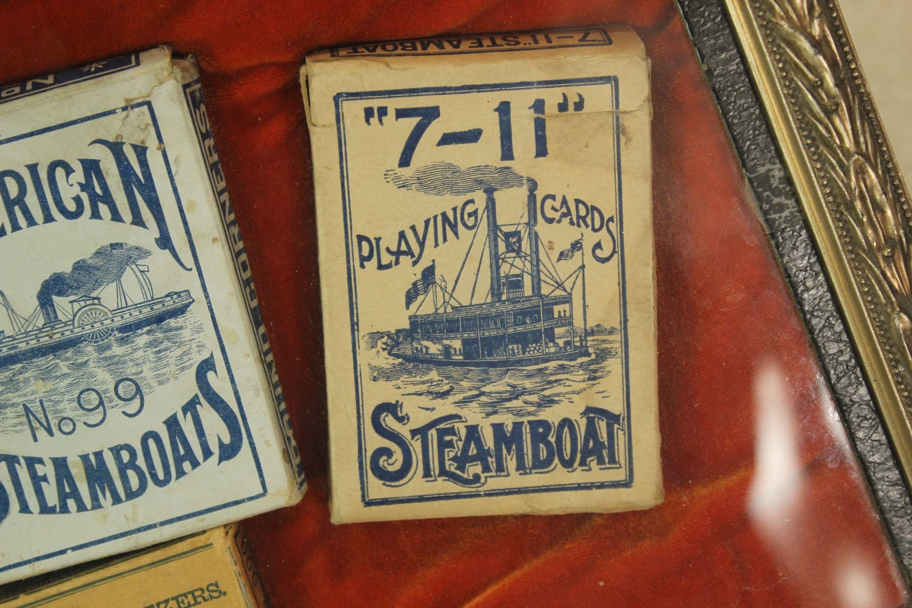 A framed display of a variety of five different antique display boxes of Steamboat playing cards.