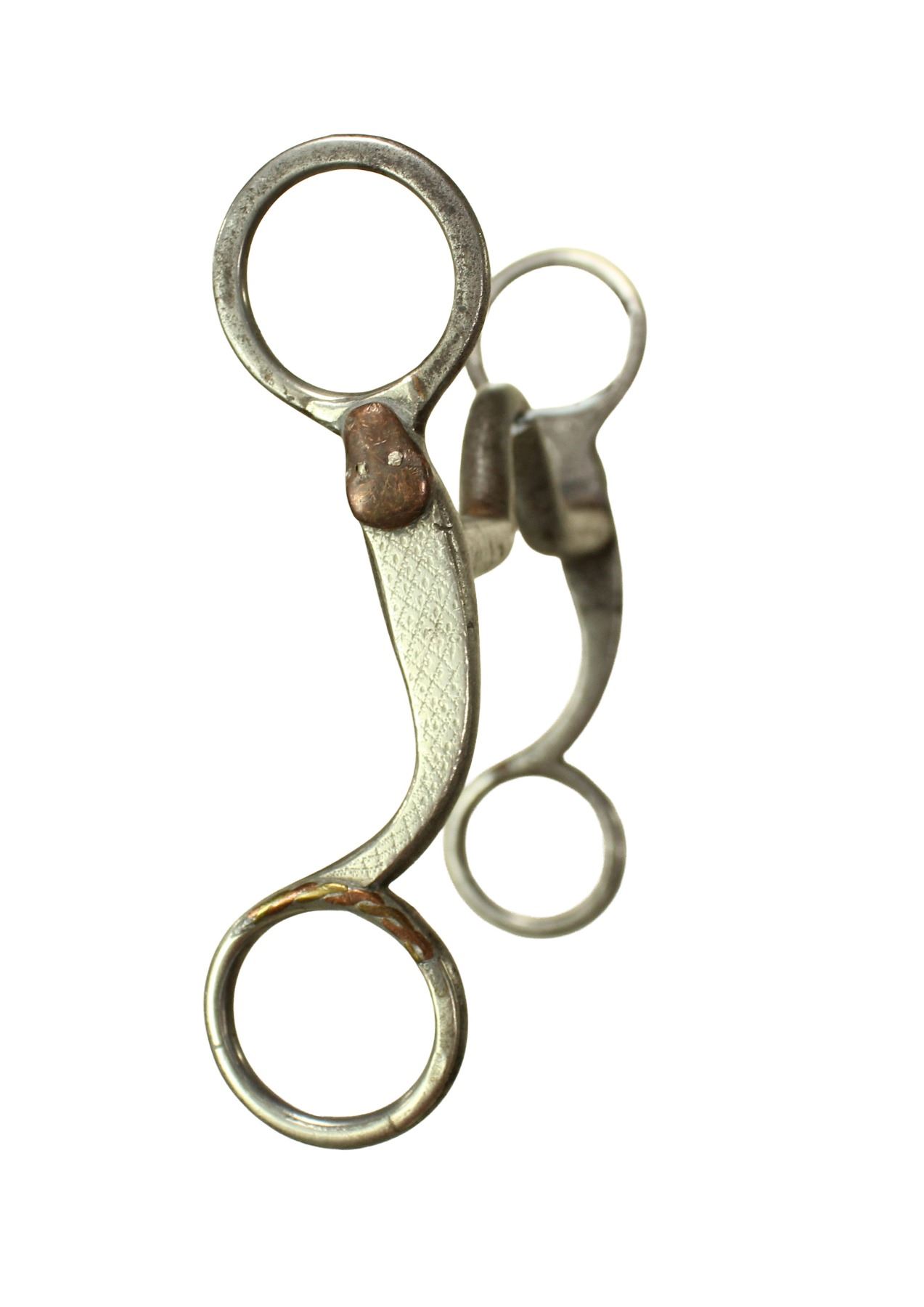 Very popular tri-tone McChesney port mouth grazing bit in snake pattern copper head and twisted rattles, showing nice condition.