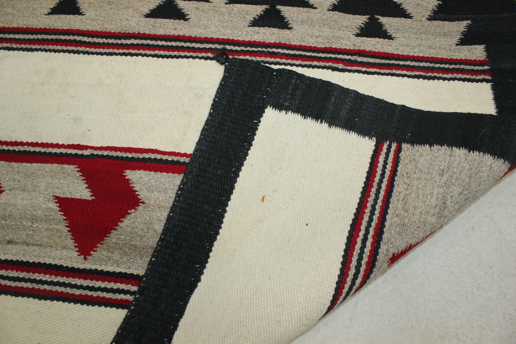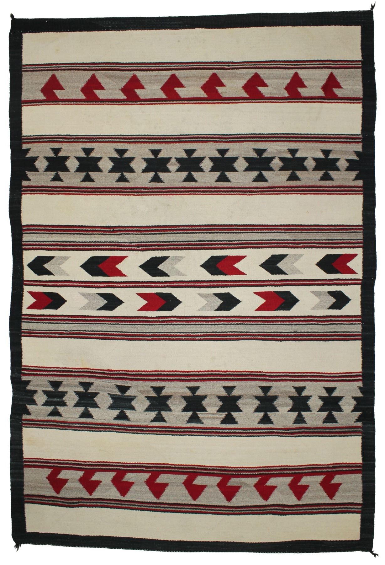 Handmade Navajo textile of Chinile and plant based dyes in an attractive banded pattern, measuring 51"x 76".