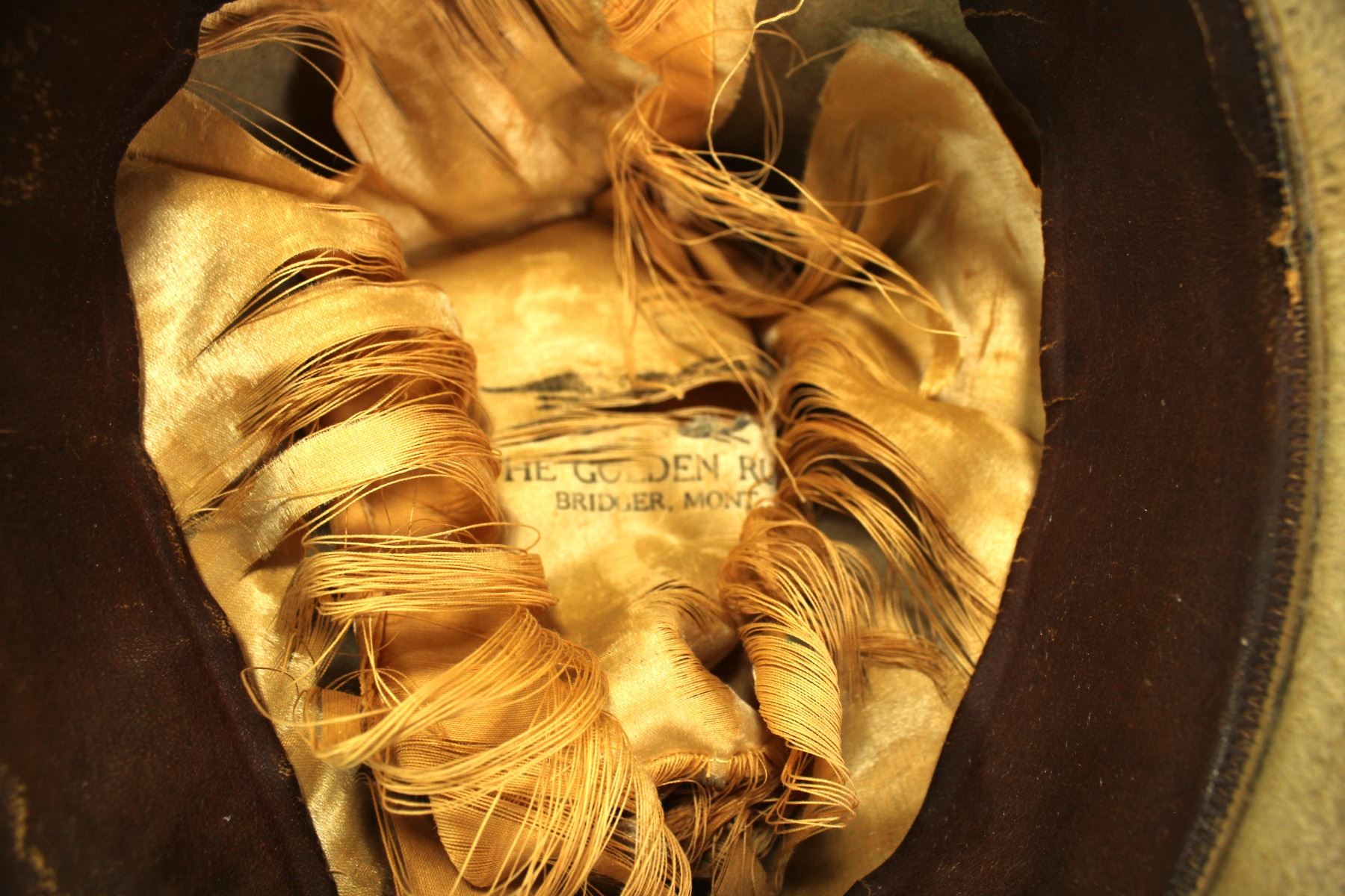 Striking early cowboy hat, of appealing nutria in natural color, with 3/4" silk band and bound edge. Boasting a silk lining marked "The Golden Rule, Bridger MT", and displaying a 7" crown, and 4 1/4" brim.