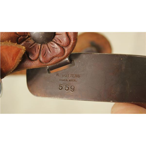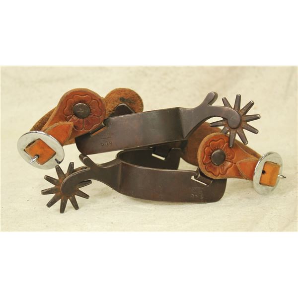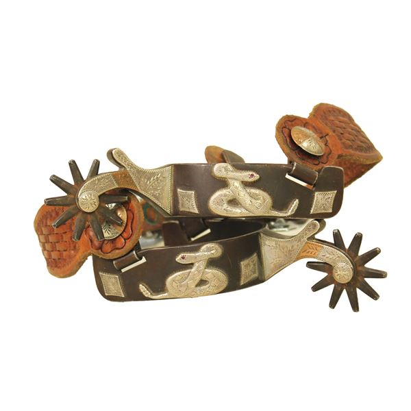 Large pair of single mounted spurs by a highly collected maker, done with a coiled snake pattern, showing mint excellent condition. Provenace: Dick Engel Collection
